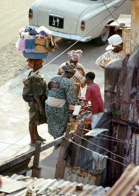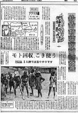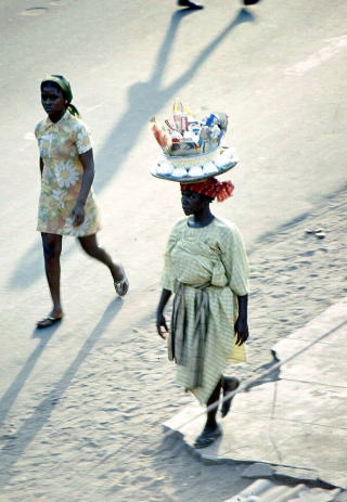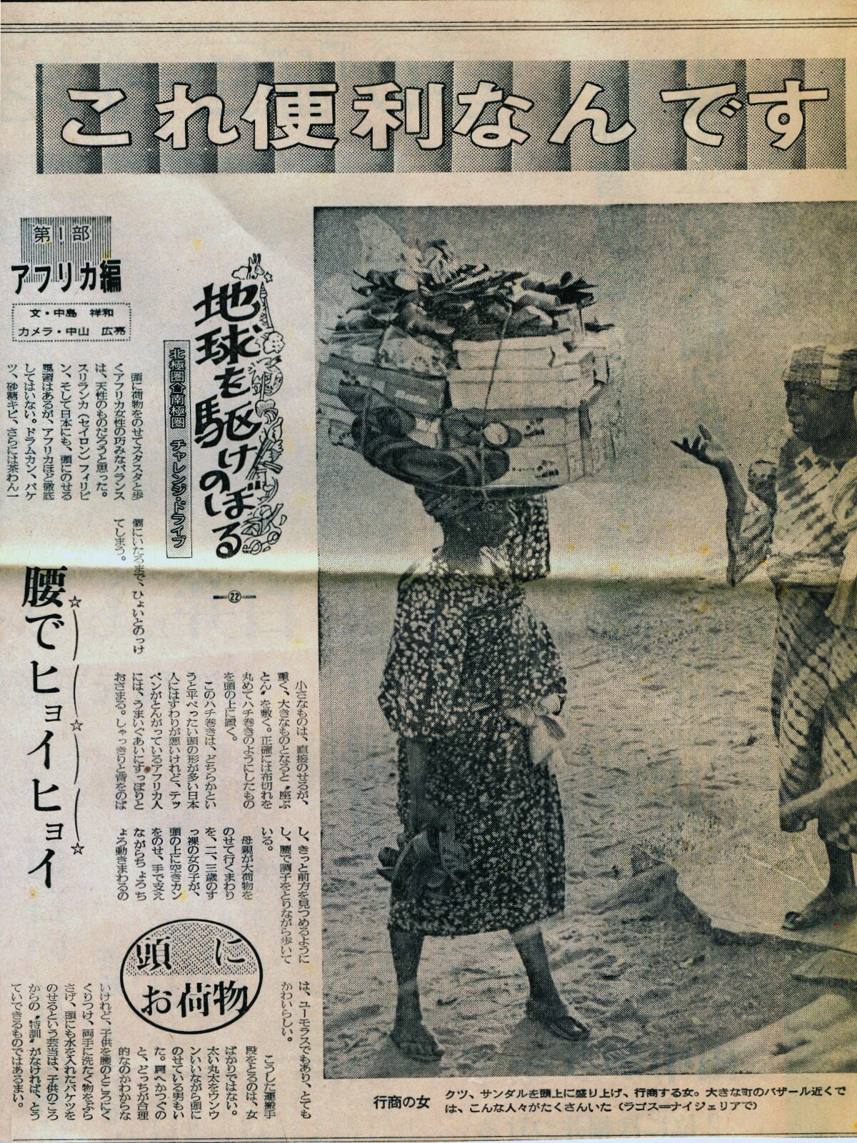 ![]() 書き写し文 頭に荷物を載せてスタスタと歩くアフリカ女性の巧みなバランス感覚は、天性のものだろうと思った。東南アジア、日本にもちょっとだけ、頭に載せる風習はあったが、アフリカほど徹底はしていない。ドラム缶、バケツ、サトウキビ、時には茶碗一個でも”頭を使う”娘がいる。小さいものは直接載せるが、大きいものはっすがに座布団、より”頭布団”とでもいうべきクッションを挟む。多くは布を撚り上げ、タコの鉢巻みたいにして頭を守る。 この鉢巻はどちらかと言うと平べったい頭の多い日本人には座りが悪いが、てっぺんが尖っているアフリカ人にはすっぽりとはまって具合がいい。彼女たちはシャキッと背を伸ばし、キリっとした姿勢で前方を見つめるようにして、腰で調子を取りながら歩く。なまけた姿勢では、到底頭の上に荷物は収まらない。母親が大荷物を載せて歩く周囲を、裸足の女の子が頭の上に空き缶を載せて、手で支えながらチョロチョロと動き回るのはユーモラスだし、可愛くもある。 こうした運搬手段をとるのは女ばかりではない。太い丸太の中央付近を頭で支え、如何にも重そうに歩く男も見かけた。肩で担ぐのと、どちらが合理的なのかは知らない。それにしても、赤子を腰のあたりに括り付け、両手に洗濯物をぶらさげ、頭には水を入れたバケツー。これはもう曲芸の世界に踏み込んではいまいか。幼少からの”修行”が無ければ、到底出来るワザではあるまい。 |