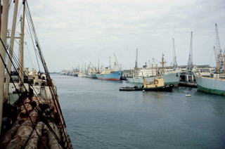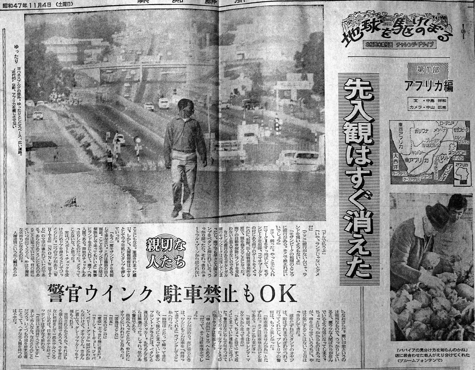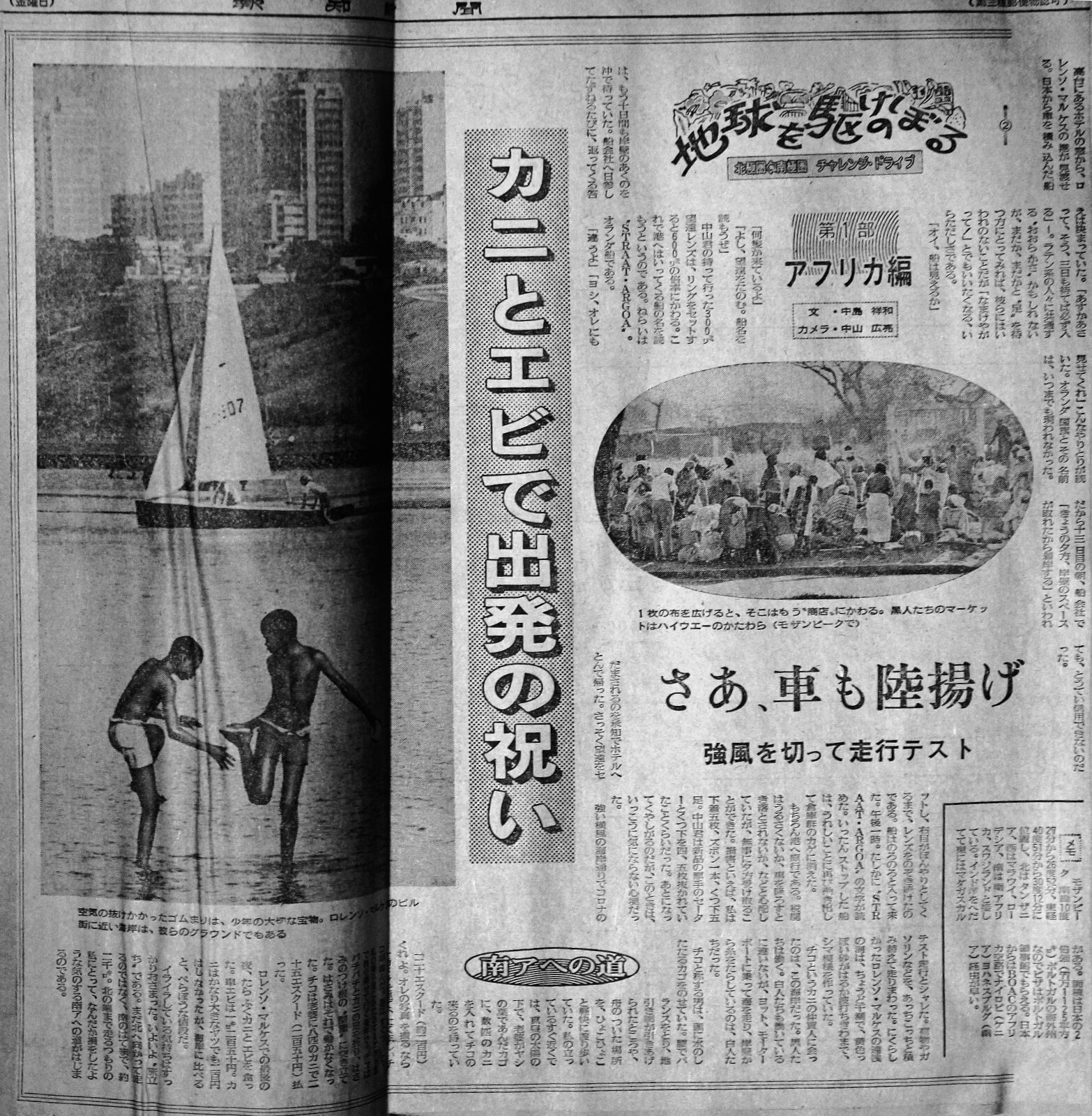 2)車が無事に到着。カニとエビで祝う 高台にあるホテルから、ロレンソマルケスの街が見渡せる。日本からの車を積み込んだ船は、もう十日間も岸壁の空くのを沖で待っていた.船会社へ日参して尋ねるたびに、帰ってくる答えは決まっていた。 「明日か,明後日。そう、三日も待てば必ず入る」-。 ラテン系の人々に共通する“おおらかさ”かも知れないが、まだか,まだかと“旅の足”を待つ者にとってみれば、彼らには言われないことなのだが「怠けやがって」とでも言いたくなるいらただしさがある。 ![]() 「船は見えるか」 「何隻か来ているよ」 「よし、望遠を頼む。船名を読もう」 中山君の持って行った300㍉の望遠レンズは、リングをセットすると600㍉の倍率にかわる。これで港へ入ってくる船の名を読もうというわけだ。狙いは“STRAAT ARGOA”。オランダ船籍だ。 「違うな」 「よし、オレにも見せてくれ」 こんなやりとりが続いた。オランダ国旗とその船の名は、いつまでも現れなかった。だから十三日目の朝、船会社で「今日の夕方、岸壁のスペースが取れたから接岸する」と言われても、とうてい信用出来ないのだった。 騙されるのを承知でホテルへ飛んで帰った。さっそく望遠をセットし、右目がぼんやりとしてくるまで、レンズを覗き続けた、船はのろのろと入ってきた。午後一時。たしかに"STRAAT ARGOA”の文字が読めた。いったんストップした船は、うれしいことに再び動き出して倉庫群のカゲに消えた。もちろん港へ直行である。税関はうるさくないが、車を降ろすときに落とされないか、などと心配していたが,無事に夕方受け取ることが出来た。損害と言えば私の下着五枚、ズボン一本、靴下五足。中山君は新品の厚手のセーター、靴下を四、五枚抜かれたことくらいだった。後になって悔しがるのだが、このときはいっこうに気にならなかった。 強い横風の海岸通りで頃なのテスト走行とシャレた。荷物やガソリンなどを、あちこちと積み替えて走り回った。憎らしかったロレンソマルケスの遠浅の海は、黄色っぽい砂が沖の波打ち際まで、しま模様を作っていた。 チコというカニの仲買人に会ったのは,この海岸だった。黒人達は働く。白人達も働いているに違いないが、ヨット、モーターボートに乗って海を走り,岸壁から糸を垂らしているのは白人たちだった。チコと称する男は、頭に水のしたたる籠をのせていた。腰でバランスをとり、地引き網が引き上げられたところや、舟の着いた場所をひょひょこと軽快に渡り歩いていた。私の立っているすぐ近くでは、真夏の太陽の下で、老婆が椰子の葉で編んだカゴに,数匹のカニを入れてチコの来るのを待っていた。 「二十エスクード(約二百円)くれよ。オレの写真を撮るなら…」チコは抜け目なく、モデル代をせびる。値切って半額にさせたが、それでもこの地では高額と言うべきだろう。チコは老婆からカニを受け取り、足をパチパチと折って、ハサミの付け根に差し込んだ。それでカニはハサミを動かせなくなった。チコは老婆に八匹のカニ代金、二十五エスクード(約二百五十円)払った。写真代はずいぶんとふっかけたものだ。 ロレンソマルケスでの最後の夜、たらふくカニとエビを食った。車エビは一㌔二百五十円。カニはかなり大きな奴でも二百円はしなかったが、海岸に比べるとべらぼうな値段だ。いらいらと車を待っていた時の気持ちはすっかり治まった。いよいよ“旅立ち”だ。 |