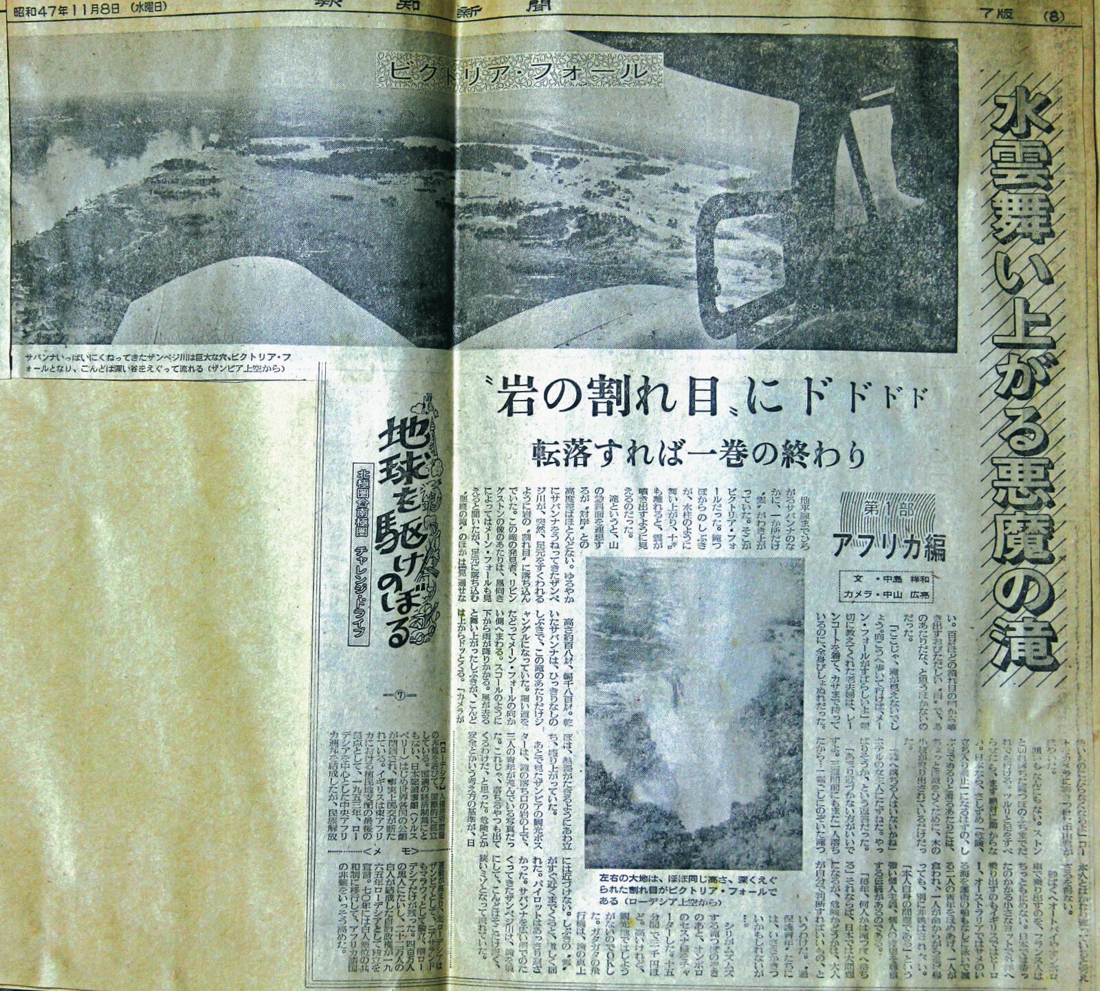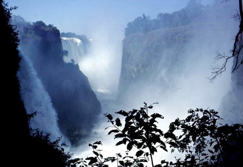 | 7)悪魔の滝・ビクトリア・フォール ![]() この滝の発見者、リビングストンの像のあたりは、風向きによってはメーン・フォールも見えると聞いたが、足元に落ち込む“悪魔の滝”の他は見通せない。百㍍ほどの割れ目の間から 吹き出すおびただしい“雨”で、あの辺りだな、と思うほかないのだった。 「ここじゃ滝が見えないでしょう。向こうへ歩いて行けば、メーン・フォールが素晴らしいよ」と親切に教えてくれた老夫婦は、r-ンコートを着て、カサまで持っているのに、全身びしょ濡れだった。 高さ約百八㍍、幅千八百㍍。乾いたさばんなは、ひっきりなしのしぶきで、この滝の辺りだけはジャングルになっていた。細い道をたどってメーン・フォールの向かい側へまわる。スコールのようにしたから雨が降りかかる。風が去ると舞い上がったしぶきが、今度は上からドッとくる。 「カメラが使い物にならなくなるよ」 コートをカメラに巻きつけた中山君がぼやいた。 囲いも何にもない。ストンと切れ落ちた滝つぼのふちまで誰でも行ける。ツルリと足を滑らせたら、先ず絶対に助からない。日本ならさしずめ「危険、立ち入り禁止」になっているはずの、しぶきでぬるりと滑るあたりには、ちょっと注意を引くために、木の小枝が放り出されているだけだった。 「滝へ落ちる人はいないかね」とホテルの女主人にたずねた。やっぱりそうか、と言う返事だった。 「あまり近づかない方がいいですよ。三週間前にまた一人落ちたから…」 霧ごしに覗いた滝つぼは、熱湯がたぎるように泡立ち、盛り上がっていた。 あとで見たザンビアの観光ポスターは、滝の落ち口の岩の上で、三人の青年が遊んでいる写真だった。これじゃ落ちるやつも出てくるわけだ、と思った。危険とか安全とか言う考え方の基準が日本人とはかなり違っていると言わざるを得ない。砂漠へオートバイやおんぼろ車で乗り出すのを、フランス人はちっとも止めない。日本では待ったの掛かる小さなヨットで外洋へ乗り出すのもイギリスではヒーロー、オーストラリアではサメのいる海を護衛の船もなしに泳いで島へと渡る冒険者を褒めあげ、一人が食われ、一人が命からがら逃げ帰っても、別に非難はされない。 「本人自身の問題である」という強い個人主義、個人の意思を尊重する伝統があるのだ。 「毎年、何人かは滝つぼへ落ちる」 それならば、日本では大問題になるが、危険かどうかは、大人が自分で判断すればいいもの、というわけだ。“過保護青年”タチには、いささかきついかも知れないが…。 シリがムズムズするような滝つぼのぞきのあと、おんぼろのセスナ機をチャーターした。十五分間で三千円ほど。高いけれど観光地では仕方がないのでOKした。ガタガタの飛行機は、滝の真上には近づけない。しぶきの“雲”がすぐ近くまで来ると、激しく揺れた。パイロットはあっさり遠ざかった。サバンナの広い幅でのたくってきたザンベジ川は、滝を境にして、今度はそこだけ深く狭いミゾとなって流れていた。
