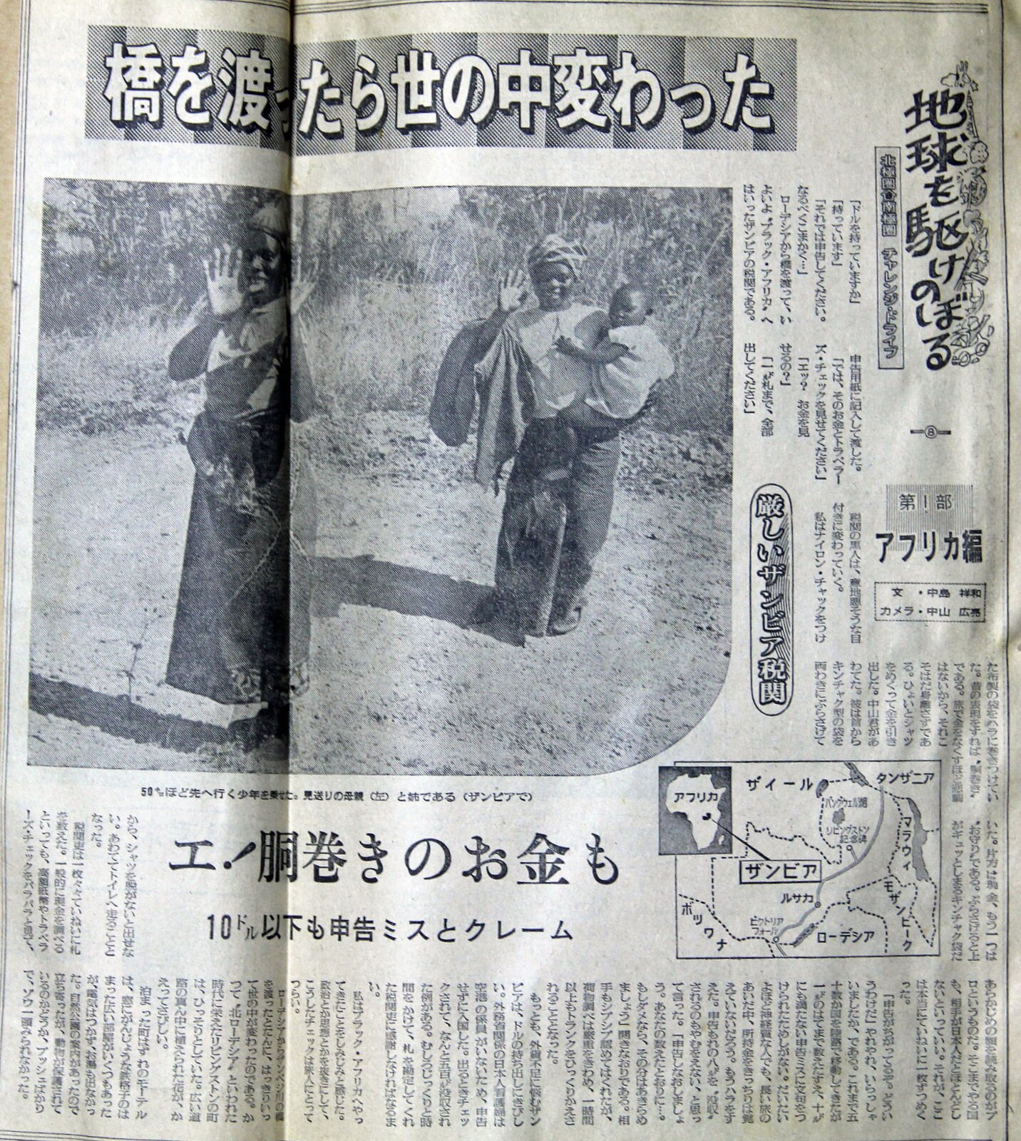 8)ザンビアの税関で ![]() ジンバブエの古代遺跡。石垣が見事だった 「ドルを持っていますか」 「持ってます」 「それでは申告して下さい。なるべくこまかく…」 ローデシアから橋を渡っていよいよ“ブラックアフリカ”へはいったザンビアの税関である。申告用紙に記入して渡した。 「では、そのお金とトラベラーズ・チェックを見せて下さい」 「エッ、お金を見せるの?」 「一㌦札まで、全部出して下さい」 税関の黒人は、意地悪そうな目つきに変わっていく。 私はナイロンチャックをつけた布製の袋をハラに巻き付けていた。昔の表現をすれば“胴巻き”である。旅で金をなくすほど悲劇はないから、それこそ肌身離さずである。ひょいとシャツをめくって金を引き出した。中山君があわてた。首からキンチャク型の袋を両脇にぶら下げていた。片方は現金。もう一つは”お守り”である。ぶら下げると上がキュッと閉まる巾着袋だから、シャツを脱がないと出せない。あわててトイレへ走ることとなった。 税関吏は一枚々々ていねいに札を数えた。一般的に現金を調べるといっても、高額紙幣やトラベラースチェックをパラパラとみて、あらかじめの額を読み取るのがプロというものだ。そこまでやる国も、相手が日本人だと殆どしないといっていい。それが、ここは本当に丁寧に一枚ずつめくった。 「申告が違ってるぞ。どういうわけだ」 やれやれ、いらっしゃいましたか、である。これまで五十数カ国を陸路で移動してきたが一㌦のはてまでかぞえたすえ、十㌦にも満たない申告ミスに文句をつけられたためしがない。だいたい、余程神経質な人でも、長い旅のあいだ中、所持金をきっちりは覚えていないだろう。もうはらをすえた。申告漏れの八㌦を“没収”されるのもやむを得ないと思って言った。 「申告し直しましょう。あなたの数えたとおりに…。もし駄目ならその分はあきらめましょう」 開き直りである。相手もしぶしぶ認めてはくれたが、荷物調べは厳重をきわめ、一時間以上もトランクをひっくりかえされることとなった。 もっとも、外貨不足に悩むザンビアは、㌦の持ち出しに厳しい。外務省関係の日本人看護婦は、空港の係員がいないため、申告せずに入国した。出る時チェックされて、なんと五百㌦没収された例がある。むしろじっくり時間をかけて、札を勘定してくれた税関吏に感謝しなければなるまい。 私はブラックアフリカへやって来たことをしみじみと感じた。政治とか思想とかを抜きにして、こうしたチェックは旅人にとって。面倒だし、つらい。 ローデシアからザンベジ川を渡ったとたんに、はっきり言って世の中が変わったのである。かつて“北ローデシア”と言われた時代に栄えたリビングストンの町は、ひっそりとしていた。広い道路の真ん中に植えられた花が、かえってさびしい。泊まった町外れのホテルは、窓にがんじょうな鉄格子のはまった広い部屋がいくつもあったが、電気はつかず、お湯も出なかった。自然公園の案内があったので立ち寄ったが、動物が保護されているのかどうか、ブッシュばかりで、ゾウ一頭みられなかった。 |