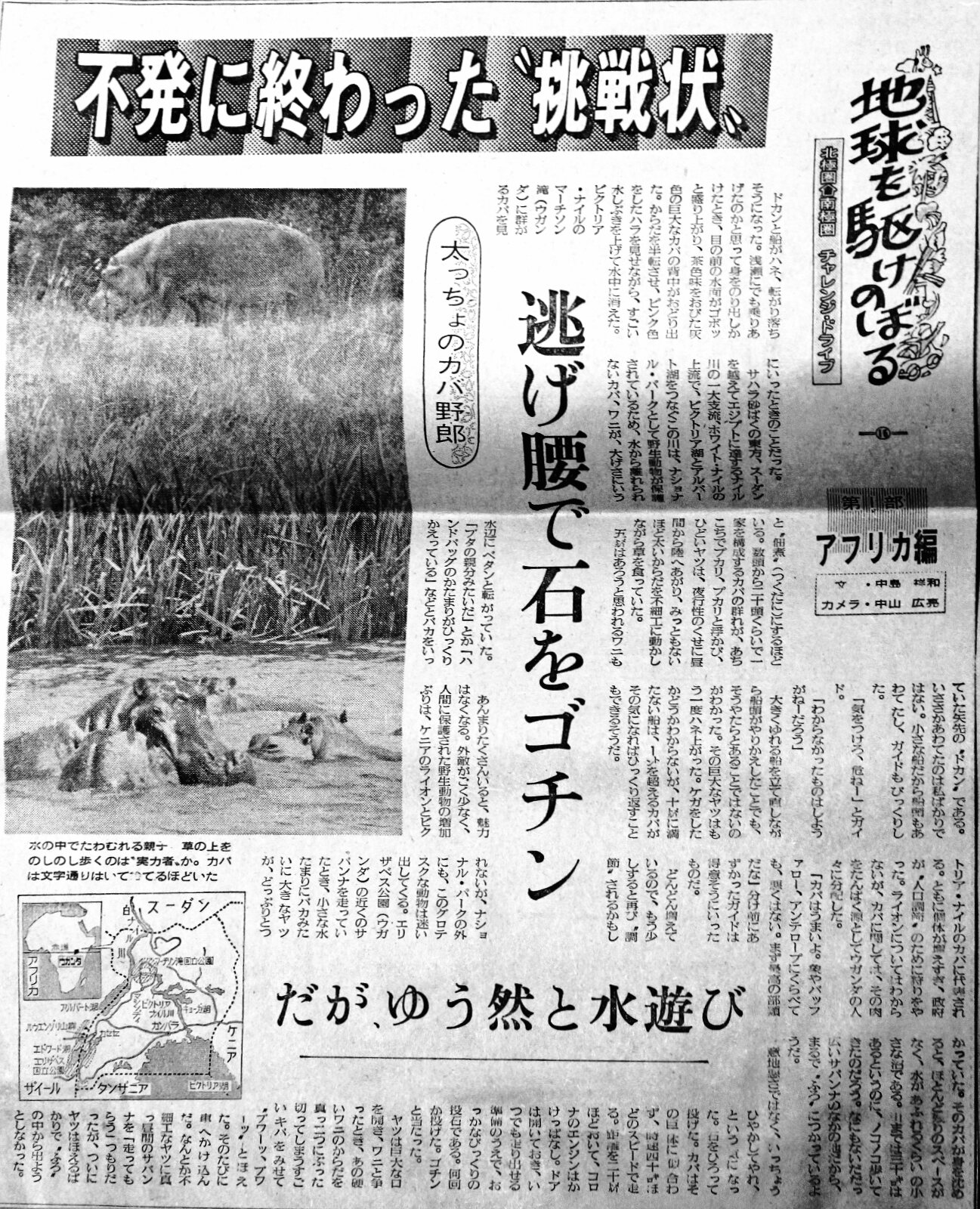 16)カバの縄張り ![]() 右・ウガンダ・マーチソンフォール近くで,カバの群れ ビクトリア・ナイル(白ナイル上流)のマーチソン瀧の近くに、カバとワニが群がっている場所がある、と聞いてコンゴへ向かう道から逸れて行ってみた。全長10㍍には満たない“観光船”の乗り場があって、泥の斜面を下り、おんぼろ桟橋から乗り込んだ。何だか危なっかし船だった。”舟”の方が適当かも知れない。 なるほど、聴いた通りカバやワニはたくさんいる。小舟と言ってもいいくらいの観光船が、つくだ煮状態のカバの集団を抜けようとしていた時、ゴツンと大きな音とともに船が傾く。ビックリ仰天というところ。聴けばカバが自分のテリトリーに侵入してきたものを、追い出すためなのだという。幸い船は何ごともないように走り続けた。 サバンナで鹿類の集団を見て遊んだあと、水たまりに2頭のカバがいるのを見つけた。川からはかなりの距離がある。太い足。丸々とした胴体。ドデカい頭。どう見ても陸上を移動するようには出来ていないが、草原の中まで“出張”してきていた。直径にするとと10㍍ほどか。そんな水たまりに入り込んでいたがせいぜい、行水、と言ったところ。いたずら心が頭をもたげ、土塊を投げたが、こちらを向こうともしなかった。体半分は小池から出ている。 カバが気にもしてくれなかったのは幸だったのかも知れない。短く太い脚。丸太を転がしたような体つきだが、時速40㌔ほどで走れるということを忘れていた。振り返って考えると、クルマは水たまりと川の間に停めていた。カバは川に向かって走る-。そんな話も聞いたことがある。危ない遊びでは有った。 |