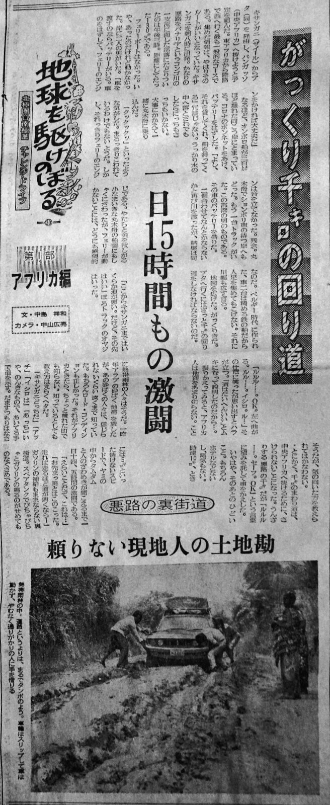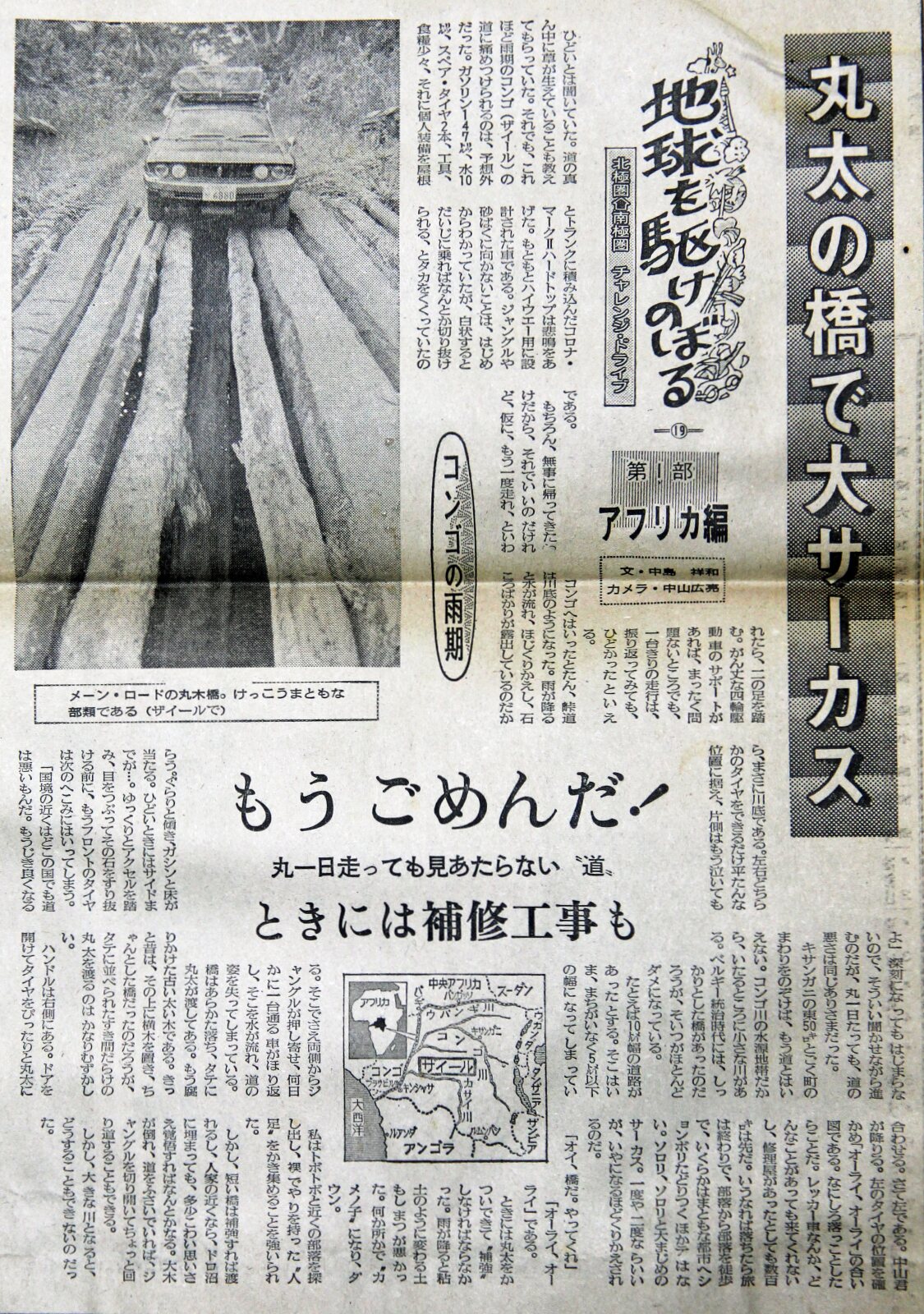 | 19)クルマで渡る丸太橋 南アから西海岸に寄って北上。ケニアから西へと走り、ウガンダまでは道路もそれほど酷くはなかった。一部区間では酷い所もあったが、主要道はほどほどだった。ケニア・ウガンダ・タンザニアは、独立後もしばらくは、旧・宗主国、英国統治の強い痕跡が残っていて、通商関係や電気などは3国共通で運営されていた。 そこまでは良かったが、ウガンダからコンゴ(当時の国名ははザイール)へ入った途端に世の中は一変した。広大なサバンナが広がる国々に比べ、コンゴは熱帯雨林、分かりやすく言うとジャングルと河川の国だった。当然、道路状況も極悪。首都のキンシャサを目指していたが、ベルギー支配時代の作られた橋は落ち、コンゴ川を渡るフェリーは沈んだり、バッテリーがなかったりだった。 地元に生活する人の殆どが、クルマとは無縁の生活をしていた。ただ、不思議に思ったのは、たばこや酒類を運ぶトラックは、一定のサイクルで奥地まで入り込んでいる。道が荒れ放題でも、何とか通れたのは、こうしたトラックが通うからだろうと思った。嗜好品、酒とたばこは、ジャングルの奥で生きる人々にも浸透していると言うことだ。 所々に引き上げてしまった入植者達のヨーロッパ風の墓地があったり、道のすぐ脇に立派な石造りの棺が幾つも並んでいるのを目にした。そういう石の棺のいくつかは、丸太が渡されていて、その上に草と木で作った現地人の家が置かれていた。雨期には水浸しになる場所を避け、一段高い棺を“土台代わり”に利用するのは、ある意味で合理的でもある。旧・支配者を“踏んづける”ような意思ではあるまい。 多少ともホテルらしき建物の有る村や街を探しながら走行するのだが、夜になってしまうことはたびたびあった。そんな時、暗い広場で足に幾つもの輪を付け、太鼓の音に合わせて足踏みをして“チャッチャ・チャツチャ”のリズムで踊る集団に出合ったりする。1970年代初頭は、まだ旅人を襲うような事件は希で、盗みや強盗に出合ったことはなかった。しかし、たった一台での旅は、かなりリスキーではある。 丸太を何本か渡した“橋”は、珍しくなかったが、例え落ちないまでも、踏み外したり、丸太の間にタイヤが嵌まってしまうと、もう動きは取れない。振り返って考えると、ぞっとするシーンは余るほど出くわしていた。窓を開けて下と前方を見る。しかし、右は見えても左が定かではない。そこはカメラマンの担当となる。 「オーライ・オーライ…」 踏み外したら旅はお終い。ジャングルに通ずる一本の荒れた道をとぼとぼと歩くのか?命さえ危うい。さらにドデカいコンゴ川も渡らにゃならん。もう一度、とは決して言えない旅だった。 |