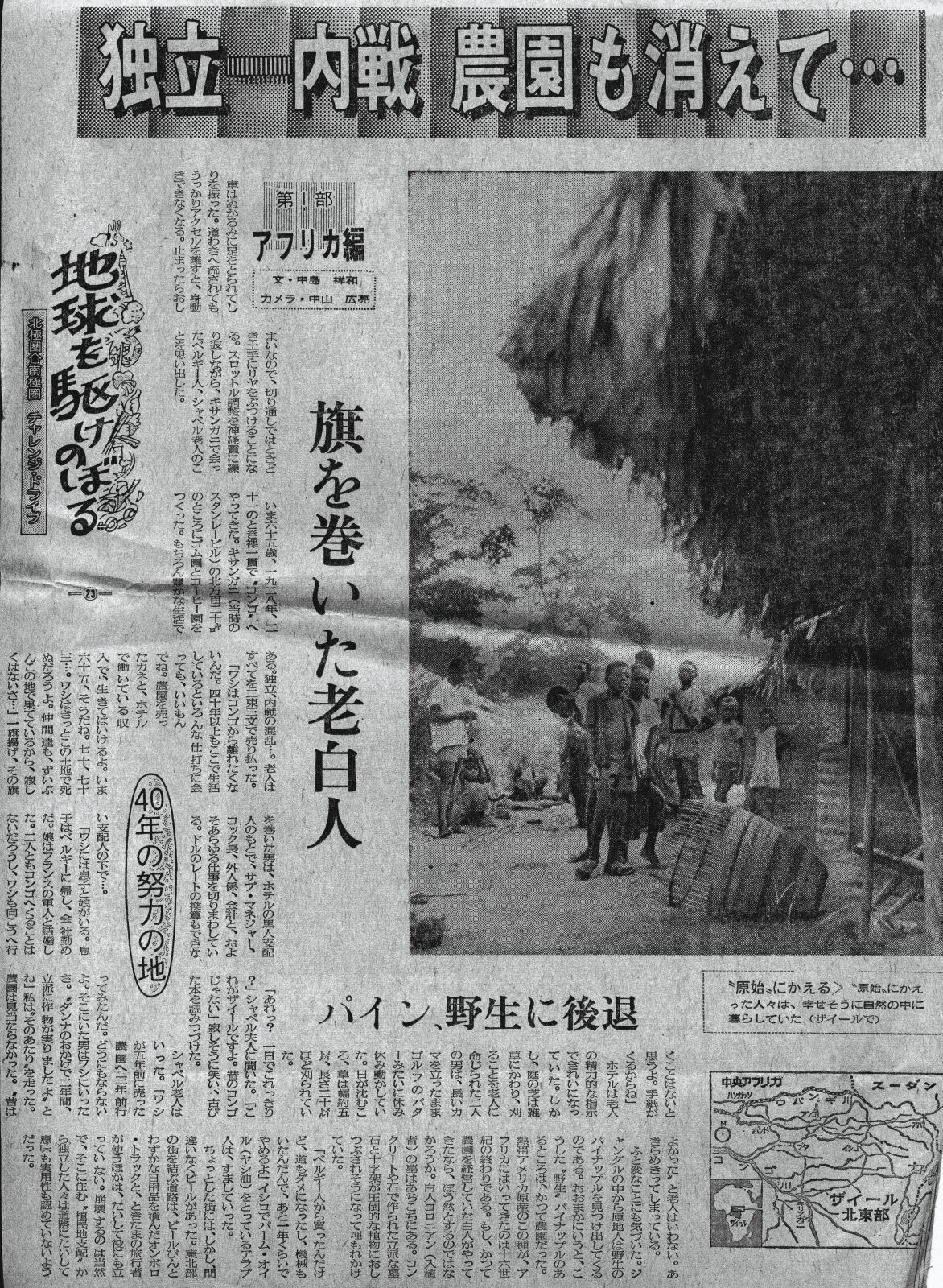 ![]() ザイール・キサンガニ(旧・スタンレービル)で65歳のベルギー出身の老人に会った。入植者の一人だ。ベルギー支配下にあったコンゴでジャングルを切り開き、農園を作り、瀟洒なホテルも作って成功者の一人でもあった。 コンゴは独立し、ザイールと国名を変えた。多くのベルギー人は故郷へと戻り、入植者の町や村には、立派な墓地が荒れたまま残され、訪れる人もないようだった。寂しい話はやめよう。この老人とは一夜の付き合いだったが、かなり笑えるエピソードを紹介しよう。 〇…「肉を食べたくないか?」 「酷い所を毎日、移動しているから、肉なんて食ってないよ」 「それじゃ、今夜はたっぷり食わしてやるよ」 結構な値段だった。いかにも高すぎるが、客もいないホテルに老婦人と二人っきりで生活している。ある程度まけさせて手打ちとなった。 「どんな肉だろうか」 「サルとかなんかだったら俺は遠慮するよ」 中山君は早々に腰が引けていた。ぼんやり部屋で休んでいる間に、居眠りでもしたのか、外を見ると夕暮れが近かった。 「ギャー、グ。ギャー」 動物の絶叫。 夕飯の時 「特別、うまい部位だ」 オヤジはポークステーキと称する肉を運んできた。 「まだあるから欲しかったら言ってくれ」 絶叫の成れの果てだった。 近所に住んでいるのだろう、現地人が何人もやってきて別棟に入っていった。なにが目的で集まってきたのかは言うまでもあるまい。 |