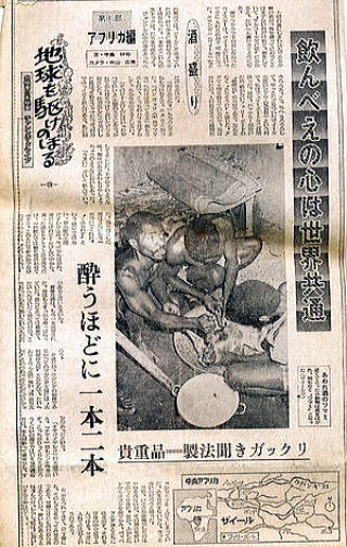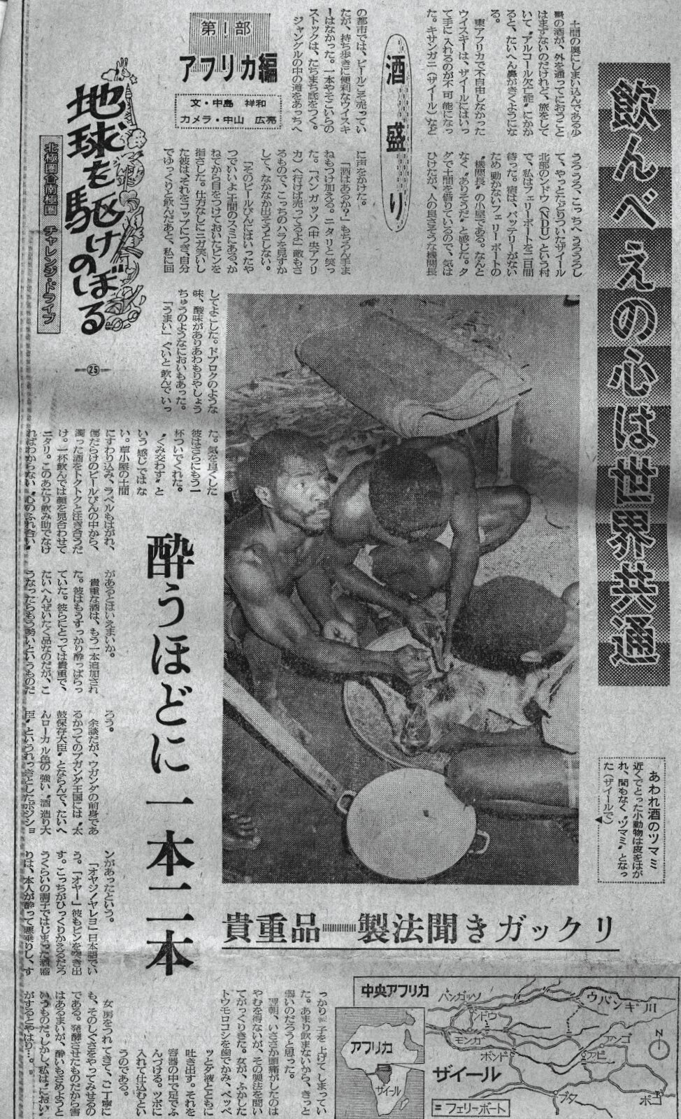 ![]() 土間の奥にしまい込んである少量の酒が、外を通って匂うことは殆ど無いのだけれど、旅をしていて“アルコール欠乏症”にかかると、大変鼻が利くようになる。東アフリカで不自由なく買ったウイスキーは、ザイールに入って手に入れるのが不可能になった。キサンガニなどの都市では、ビールこそ売っていたが、持ち歩きに便利なウイスキーは売ってなかった。一本やそこいらのストックはたちまち底をつく。 ジャングルの中の道をあっちへうろうろ、こっちへうろうろして、やっとたどり着いたザイール北部のンドウ(NDU)と言う村でフェリーを二日間待った。宿はバッテリーがないため動かないフェリーの“機関長”の小屋である。何となく“有りそうだ”と感じた。タダで土間を借りているので、気は引けたが、人の良さそうな機関長に声を掛けた。 「酒はあるか」 もちろんグイッとあおる手真似も添えた。機関長はニヤリと笑った。 「バンガッソ(中央アフリカ)へ行けば売ってるよ」 “敵”もさるもので、こっちの腹を見透かして、出そうとはしない。 「そのビール瓶に入った奴で良いよ」 目を付けていた瓶を指さした。仕方なさそうに苦笑いした彼は、コップに注ぎ、自分でゆっくりと飲んだあと、私に廻してよこした。ドブロクのような味。酸味があり泡盛や焼酎のような匂いもあった。 「旨い」 余談だが、ウガンダの前身であるかつてのブガンダ王国には、“太鼓保存大臣”と並んで“酒造り大臣”というれっきとした役職があったのだという。 「オヤジ、飲めよ」と日本語で言う。もちろんオヤジはそれに応えて、持っていたコップを突き出す。一杯から始まった酒盛りは、オヤジが酔って調子を挙げてしまっていた。滅多に飲まないので、すぐに酔ってしまうんだろうと思った。翌朝、いささかの頭痛が残ったのはやむを得まい。しかし、あくまで人の良い機関長は、女房を呼び、造り方を実演させた。 |