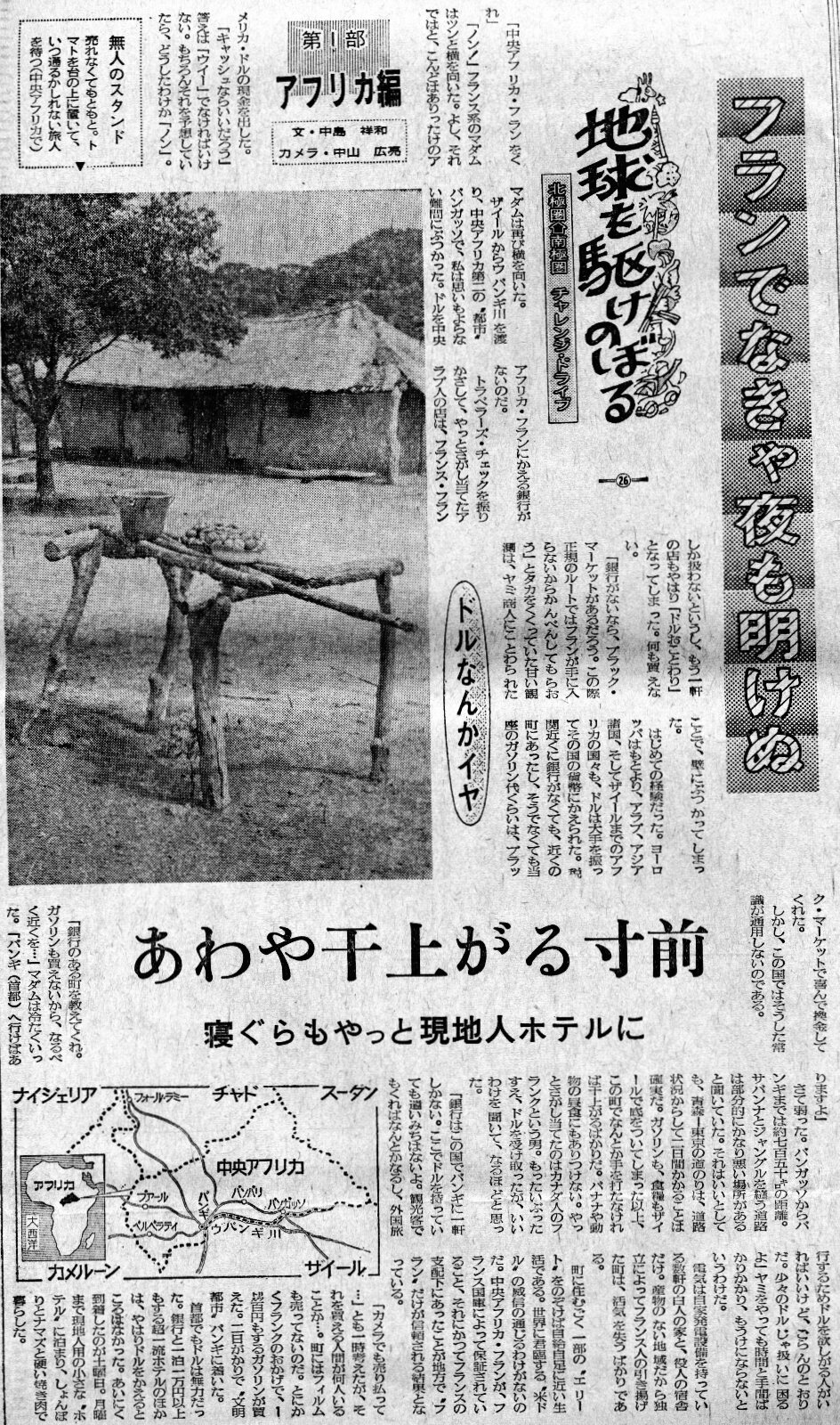 ![]() ザイールから支流のウバンギ川を渡って中央アフリカに入った。バッテリーを2個つないで、やっと動いたフェリーでどうにか川越が出来た。 「中央アフリカ・フランは入手出来ないか」 「ノン!」 フランス系マダムはツンと横を向いた。それでは、とドルの現金を出した。答えは「ウイ」でなければいけない。もちろんそれを予想していた。マダムは再び横を向いた。 ザイールからウバンギ川を渡り、中央アフリカ第二の都市、バンガッソで思いもよらない事態にぶつかった。ドルを中央アフリカ・フランに替える銀行がない。トラベラーズチェックを振りかざし、やっと探し出したアラブ人の店はフランス・フランしか扱わないという。もう一軒の店も「ドルはお断り」だった。何も買えない。 「銀行がないなら、ブラックマーケットがるだろう」 この際、正規のルートではフランが手に入らないなら、とタカをくくっていたけれど、闇商人にも断られ、解決のできない壁にぶつかってしまった。中央アフリカフランなら、何とか手に入るだろうと思ったが入手できない。出来ても受け取りを嫌がる。自分の国の通貨なのに…。 こんなことは初めての経験だった。国際通貨としては決して強くはないフランス・フランが幅を利かせている。ヨーロッパはもとより、アラブ、アジア諸国、隣国ザイールまでドルは大手を振ってその国の貨幣に替わった。税関近くに銀行は無くても、近くの町にはあった。そうでなくてもブラックマーケットまがいの個人が、喜んで換金してくれた。しかし、この国ではそうした”国際常識”が通用しなかった。 「銀行のある街を教えてくれ。ガソリンも買えないから…」に、マダムは冷たく言った。 「バンギ(首都)へ行けばありますよ」 さて弱った。ここからバンギ迄約750㌔ある。サバンナとジャングルを縫う道だが、部分的にはかなり悪い所があると聞いていた。それは良いとしても青森~東京の道のりは、道路状況からして2日は確実にかかろう。ガソリンも携帯食料もザイールで殆ど底をついてしまったた以上、この町で何とかしないと干上がってしまう。昼食はもちろんバナナすら入手できない。やっと探し当てたのはカナダ人と称するフランクという男。もったいぶった末ドルを受け取ったが、訳を聞いてなるほどと思った。 「銀行はこの国に一軒しかない。バンギにある。ここでドルを持っていても遣い道はないよ。観光客が来るとか、旅行をするためにドルを欲しがる人がいればいいけど,ごらんのとおりだ」 闇屋をやっても儲けにはならないということだ。 電気は自家発電装置を持っている数件の白人の家と役人の宿舎だけ。目立つ産物や産業のない地域だから、フランス人が引き上げた町は、活気を失うばかり。町に住むごく一部の人を除くと、自給自足に近い生活だ。世界に君臨する米ドルの威信が通じるわけもないのだ。中央アフリカ・フランが、フランスの国庫によって保障されていること、それにかつてフランスの支配下にあったことが、地方でフランだけが信頼される結果になっているとみた。 「カメラでも売り払って」とも一時考えたが、それを買える人が何人いることか…。町ではフィルムも売っていないのだ。とにかくフランのおかげで1ℓ100するガソリンが買えたた。二日がかりで”文明都市”バンギに着いた。首都でもドルは無力だった。銀行と、一泊一万円以上する超高級ホテルの他は、やはりドルは使えなかった。到着したのはあいにくの土曜日。月曜まで現地人用の小さな宿に泊まり、ションボリと鯰と固い肉で過ごした。 |