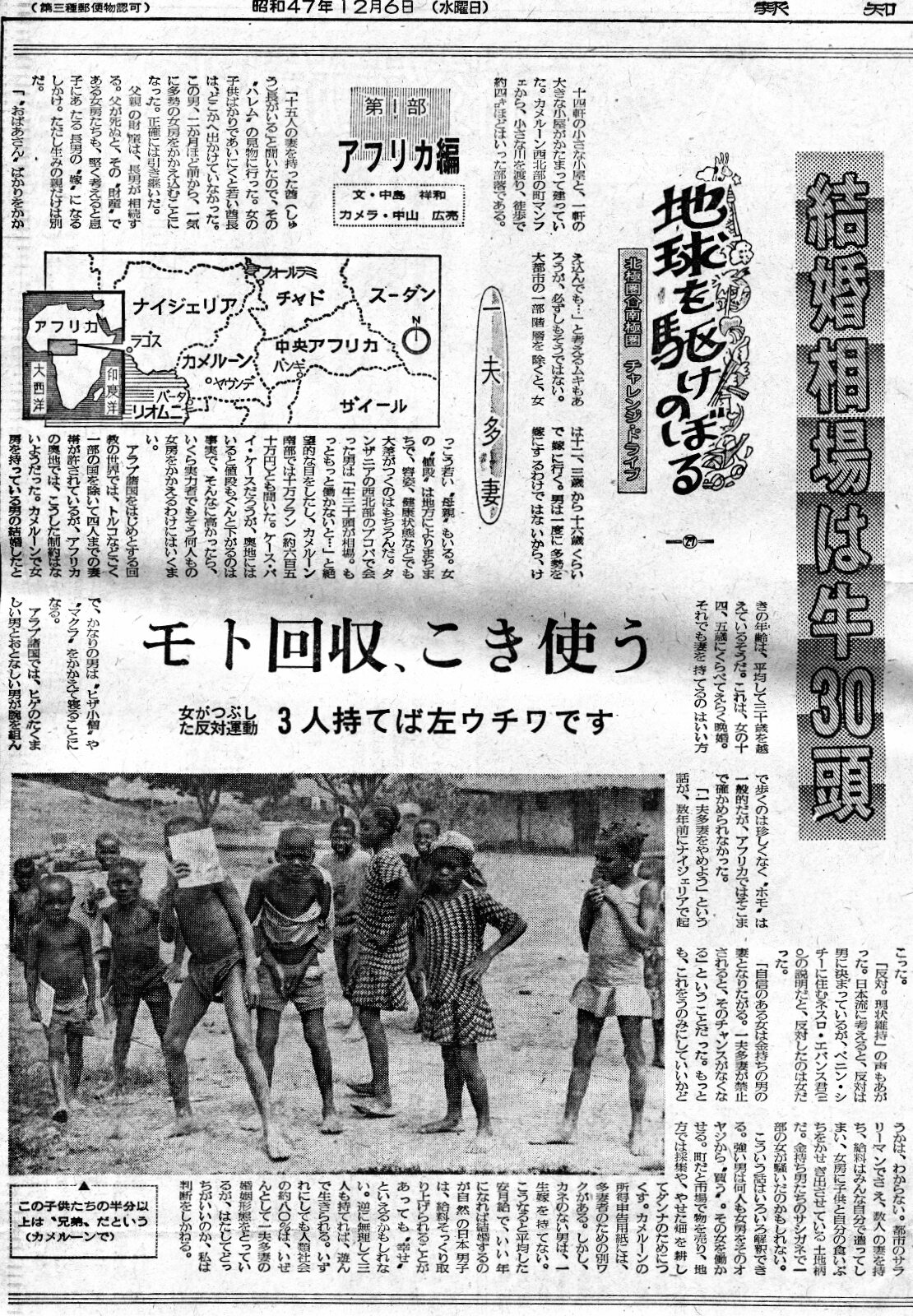 ![]() 十四軒の小さな小屋と、一軒の大きな小屋が、固まって建っていた。カメルーン西北部の町、マンフェから小さな川を渡り、徒歩で4㌔ほどの部落である。 「十五人の妻を持っ酋長がいる」と聞いたのでそのハーレムを”見物”に行ったのだ。女の子供ばかりであいにく酋長はどこかへ出かけていなかった。この男、二か月ほど前から、一気に大勢の妻を抱え込むことになったという。正確には引き継いだ。父親の資産は長男が相続する。父が死ぬとその財産である妻たちも長男の嫁になる風習なのだ。父親の妻Dは、日本で考えると”義理の母”ということだが、そうではない。女棟だけ。ただ生みの母だけは別だ。 「お婆さんばかり抱え込んでも…」と考える向きもあろうが、必ずしもそうではない。大都市の一部”階層”を除くと、女性あ12,3歳から16歳くらいで嫁となる。男は一度に大勢を嫁にする訳ではないから、結構若い”義理の母親”もいる。嫁の”値段”は地方によって異なるが、容姿、健康状態などでも大差のつくのはもちろんのこと。タンザニアの西北部、ブコバで会った男は「牛30頭が相場だな。もっと働かにゃ、嫁は持てない」と絶望的な目をしたし、カメルーン南部では十万フラン(約650万円)ダト聞いた。結構なお値段なので、実力者と言ってそう何人も女房は持てない。 アラブ諸国をはじめとするイスラム圏では、トルコなど一部を除いて四人までの妻帯が許されているが、アフリカの奥地では、こうした制約はないようだった。カメルーンで妻帯している男の結婚当時の年齢は、平均して三十歳を超えているようだ。これは女の十四、五歳に比べて随分と晩婚。それでも妻を持てるのは良いほうで、かなりの男は”膝小僧”や”枕”を抱えて寝ることになる。アラブ諸国では濃いひげを蓄えた男と、なんとなく弱弱しい男が、腕を組んで歩く姿を見かけるが、アフリカではそこまで確かめはしなかった。 「一夫多妻はやめよう」という話が、数年前にナイジェリアで起こった。「反対!現状維持」の声もあった。日本流に考えると、反対は男と思いがちだが、ベニンシティーに住むネスロ・エヴァンス君(20)は、反対したのは女だという。 「自信のある女は金持ちの男の妻となりたがる。一夫多妻が禁止されると、そのチャンスがなくなる」 もっともこれをうのみんしていいかどうかは、分からない。若年のサラリーマンでさえ数人の妻を持ち、給料は全部自分で遣ってしまい、女房子供と自分の食い扶持迄稼ぎ出させている土地柄だ。女が騒いだというのも頷けるが、金持ちの男の差し金かもしれない。こういう話はいろいろと解釈できる。強く、金持の男は何人も妻を買うことが出来る。町では市場で物を売り、地方では採集や、やせた畑を耕して旦那の為に尽くす。カメルーンの所得申告用紙には、多妻者のための別枠がある。 金のない男は一生、嫁は娶れない。こうなると平均した安月給で、いい歳になると自然に結婚する日本の男は、給料をそっくり取り上げられることがあっても、幸せと言えるかもしれない。一夫多妻では三人も妻を持てば遊んで生きられる境地に達することが出来るようだが、そういう恵まれた?男は少ない。いずれにしても人類社会の約80%は、依然として一夫多妻の婚姻形態をとっているが、果たしてどっちがいいのか、判断しかねる。 |