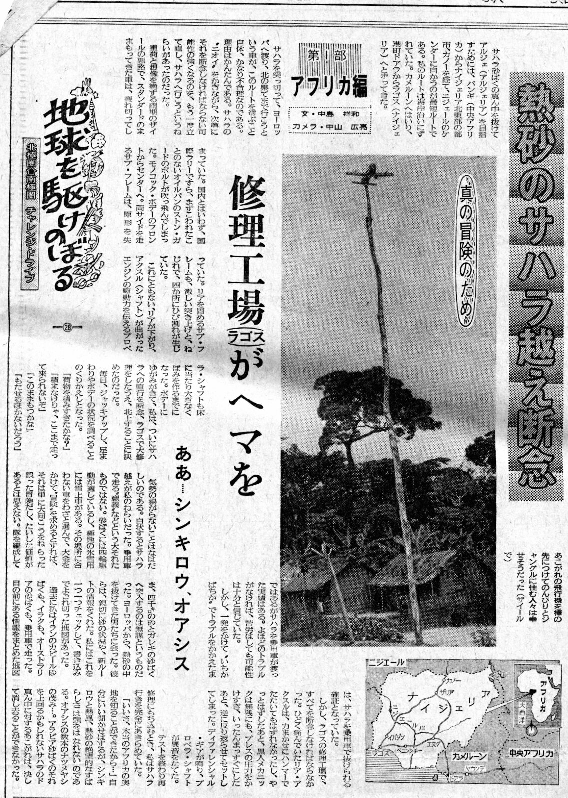 ![]() サハラ砂漠の真ん中を北上し、アルジェ目指すためには、バンギ(中央アフリカ)からナイジェリア北部のカノーを経て、ニジェールのケンダーに向かうのが最短ルートである。しかし、私の選んだルートは海岸へと向かっていた。カメルーンの港町、ドアラから、ナイジェリアのラゴスへと走ってきた。サハラを突っ切り、ヨーロッパへ渡り、北の果てまで行こうという車が、このルートをたどっていること自体、大変に不合理である。 理由はサハラの”匂い”を感じながら、次第にそれを断念しなければならない、トラブルの可能性が強くなるのを、もう一度立て直してサハラへ行こうという狙いがあったのだ。想像を絶するザイールの悪路を雨季にこれといった改造も補強も施していないノーマルのマークⅡは、疲れ切ってしまっていた。オイルパンを守るストーンガードのボルトは吹っ飛んでしまっていた。ボディーの左右を走るサブフレームは原型を失いかけていた。リアを固めるサブフレームも、激しい突き上げと悪路による”ねじれ”でひび割れが生じていた。 これに伴い、リアが下がり、エンジンの駆動力をリアン伝えるプロペラシャフトも床に当たり、大きな窪みを造り始めていた。ボディーにもゆがみが来て、サハラへ直行するのを断念せざるを得なかっのだ。毎日ジャッキアップして、足回りやボディーの状況を調べる繰り返し。 「荷物を積みすぎたかな」 「積まなけりゃ、ここまで来られない」 「このままもつかな」 「もたせるほかないな」 気勢の上がらないことはなはだしかった。サハラ越えは大きな狙いだった。乗用車で走る”意義”などという大それたものではない。砂漠には四輪駆動が適しているし、極地の氷雪用には雪上車がある。その地域に適合しないクルマを敢えて選んで、冒険を求めるとしたら、それは大向こうを狙った誤った冒険だし、大した価値がるとは思わない。 隊を編成してではあるが、サハラを乗用車が走った実績はある。よほどのトラブルがなければ、苦労はしても可能性は十分と信じていた。 しかし、一発をかけて、一か八かでトラブルを抱えたまま、長大なサハラ砂漠の砂と岩のかけらの”踏み跡”へ突入するのは無謀というものだ。ヨーロッパから熱砂の中を抜けてきた男たちに会った。彼らは親切に砂の状況や、新ルートの情報をくれた。私はこれを一つ一つチェックして、書き込みで汚れた地図にさらに書き込んだ。かつて私はイランのかビール砂漠、イラクの砂漠地帯も走った。オーストラリアは周回した上に、内陸砂漠へも足を延ばした。目の前にある情報を書き込んだ地図は、サハラを乗用車で抜けられる確証となった。 しかし、ラゴスの修理工場ですべてを断念しなければならないことになった。リアアクスルはハンマーでたたいてもはずれなかったし、やっと外したあと、現地人のメカニックは無残にもプレスの圧力をかけすぎて、いったん真っすぐに修正したのに、さらに圧をかけすぎて、今度は逆に反らせてしまった。デフが鳴り、プロペラシャフトが異音を発した。テスト走行をして工場に戻った時、サハラ行きを完全にあきらめていた。 「本当のアフリカの奥地を知ることが出来たので、良いとするしかないな」 そう自分に言い聞かせはするが、蜃気楼や熱風、熱砂の極限の凄さ、星空の気味が悪いほどの美しさ、素晴らしさは頭を離れない。オアシスのナツメヤシの茂みも…。アラビア砂漠、イランの砂漠とはまた違った、サハラのど真ん中に対する夢想を、決して消し去ることはできなかった。 |