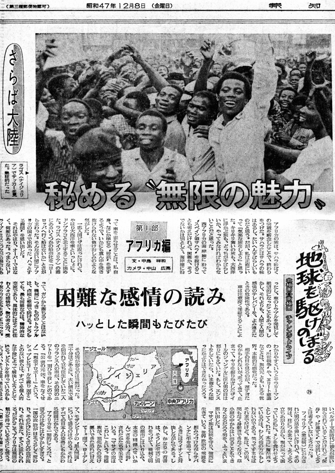 ![]() アフリカの旅はサハラ砂漠の突破を断念したことで終わりを告げた。息づまるようなコンゴ川流域の旅は、凄まじいまでの自然の猛威に、人々は半ば飲み込まれながら、何とか調和を探しだして生きているようにも感じた。しかし、ナイジェリア・ラゴスまでやってきたのは、サハラを何とか走り抜けたい思いからだった。車は草臥れ果てていた。この辺りの経緯は前節で書いた。 それでも一抹の希望を持って、ラゴスの自動車整備工場で車の”建て直し”をしながら、西アフリカの国々の入国ビザを取得するために領事館を巡った。取得は出来た。日本のパスポートの力量、言ってみれば日本の国力を味わうことでもあった。近隣諸国の多くは、旅行者が入国ビザを取得するのは困難だった。南の幾つか独立前、植民地のままだった国は、露骨な掲示まであった。 入管や商店にこんな文言の書かれた表示があったのだ。 「ホワイト→」 「ノン ホワイト→」 ある商店でものを買おうとしたら「裏へ回れ」と言われた。どう言うことだろうと、言われるままに裏口へ廻った。 「パスポート!」 しばらく並び、順番が来た。老婆が小さな窓から声を掛けた。取っ替え引っ替え、パスポートを見ていた。 「表に行け。ここじゃない」 面倒を避けるために、アジア人、有色人種に間違いない中山君と二人は「ノン ホワイト」の入り口に廻ったのだ。間もなく分かった。日本人は異例の「白人待遇」という奇妙な区分けに入っていた。「表に行け」はそのためだった。何だか厭な感じはしたが…。これも国力の問題と同時に、列強のずるさでもあろう。戦後間もなく、猛烈に働いた日本人は、世界情勢の移り変わりの荒波を巧みに避けながら、経済成長を続けていた。私自身、休暇は取れずにいたが 「幾日休みを取ってない?」と聞かれ「一ヶ月ちょっと」と返答すると 「そりゃ、良いペースだ」 こんな時代で、それを不思議にも思わなかった。 アフリカには数々の種族がそれぞれの伝統を守りながら、近代化に邁進している最中だった。その点で、旅をするには疑いもなく”良い時代”だった。銃による支配の残滓は、そこここに残って居て、旅人に危害を加える人はいなかった。たった一台の、丸腰の車に乗った日本人は、ひ弱でもある。脅されたり、襲われたらひとたまりもない。しかし、そういうことはなかった。鶏を“ひき逃げ”したフランス人のとばっちりで、槍をかざした男に襲われそうになったとき以外は…。 アフリカを一面的に捕らえるのはムリだ。どういう所だ、と聞かれ答えるのも私には難しすぎる。一国の体制がめまぐるしく変わっている時でもあった。そのたびに大量の血が流される。そんな繰り返しの中でアフリカは未開の世界から目覚め、無限の魅力を持って立ち上がろうとしているのだろうか。 (アフリカ編/終わり) |