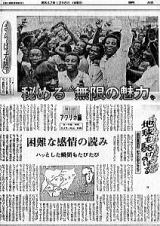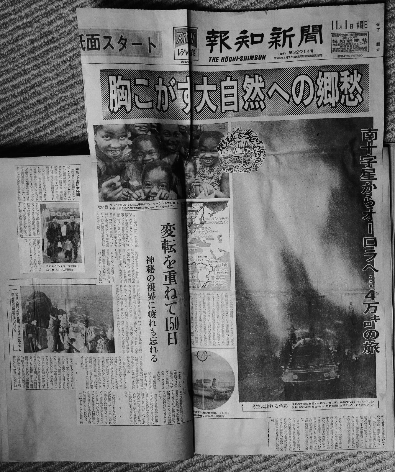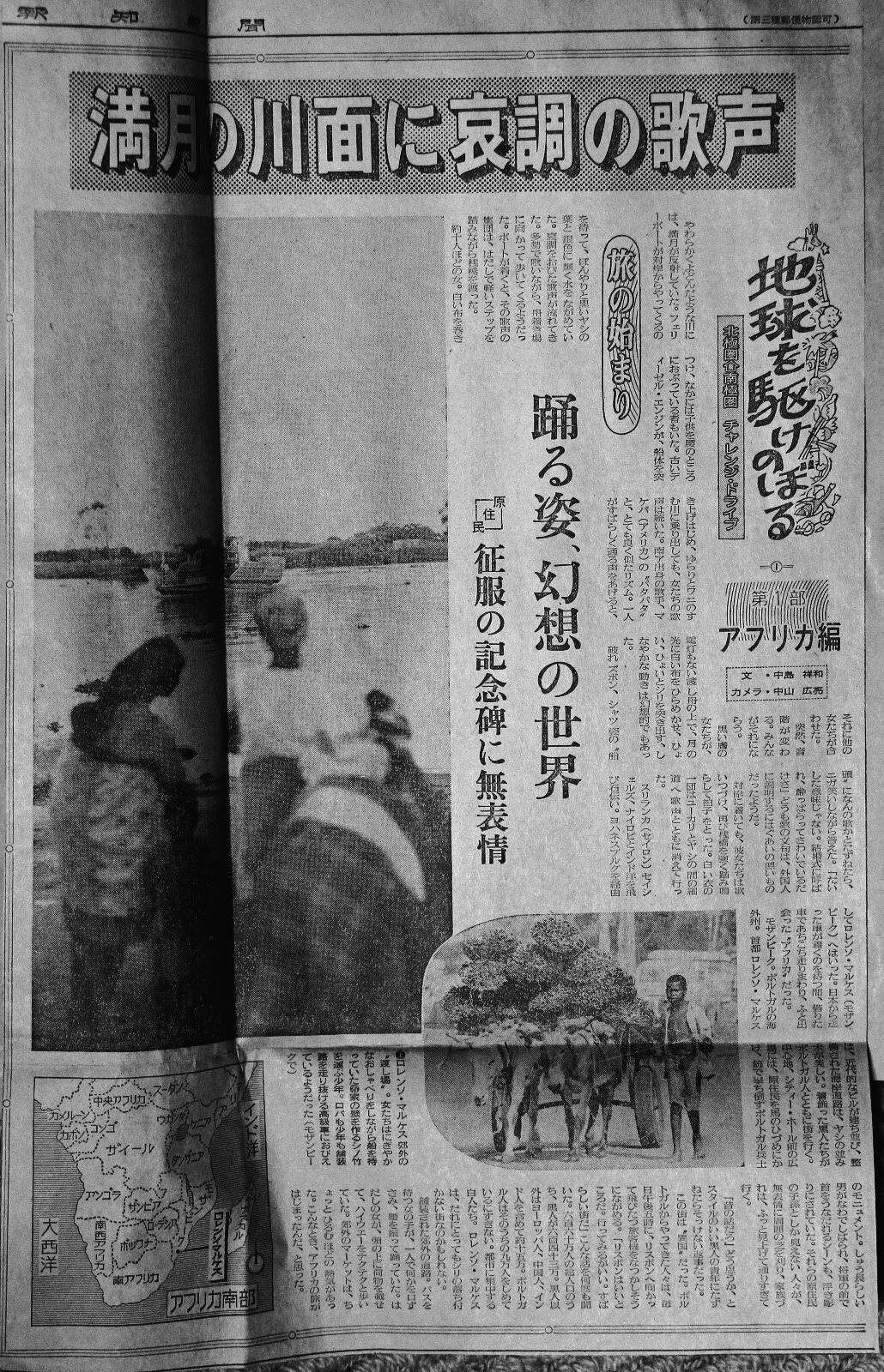 ![]() 乾いたサバンナを、赤茶色のタンガ(体に巻き付ける布)をまとい、ヤリをかついだマサイの男が牛を追っていた。東アフリカの高原はゆるやかな丘が連なり、かなたには雪をかぶったキリマンジャロがぽっかりと浮かぶ。二、三戸の小屋があった。車をとめた。途端に女が丘を振り仰いで大声で叫んだ。枯れ草の斜面をタンガをはためかせ、ポッ、ポッと砂ぼこりをあげながら男がかけてきた。細い足、広い歩幅、しなやかで強靱な姿が、抜けるような乾期の空に美しかった。 右手にヤリ、刃渡りは1㍍はあろうという大物。きらめく穂先は圧倒的な迫力で近づいて来た。バサッとまといつくタンガが跳ね上げられ、男はヤリを握った右手を振りかざした。左手を横に開き、投げる構えに入り、そう遠くではないところへと投げた。 競技のやり投げとは違う。遠くへ投げるのが彼らの生業ではない。槍が狙った獲物に突き刺さる距離が大切なのだ。遙か昔、サハラの北からブラックアフリカへ放牧しながら入り込んできたマサイ族は、ナイロビやダルエスサラームなど、東アフリカの大都会、近代文明に背を向けて、猛獣のたむろするサバンナで牛を追って生き続けている。今は観光客に踊りを見せたり、立ち姿を写真にとらせたりして稼ぐ”観光マサイ”も多くなった。 ナクル(ケニア)の病院で日本人医師に会った。マサイの話しになるとこんなことを言った。 「輸血用の血液がなくなっちゃうんですよ。初めは不思議に思ったが、彼らの病室へ置いて目を離すと必ずなくなる。後で分かったんですが、飲んじゃうんです」 牛の血液と乳を主食としている彼らは“病人食”ではとうてい満足出来ないのだろう。ライオンに食いつかれたり、引っかかれたり、肋骨をサイに突かれてパラリパラリと折られた者もいるという。ヤリ一本で立ち向かうなどと云うことは、遠い昔の話しだと思っていたが、医師は約半年間におわたる外傷者のカルテをめくり、その証拠を見せてくれた。 ✕ ✕ ✕ ✕ ✕ ![]() コンゴ川の支流(中央アフリカ) 南ア、ローデシアに代表されるホワイト・アフリカ。ナイロビを中心とする東アフリカは、さらりと見る限り、動物の住む快適なサバンナであり、文明と自然のマッチした美しいアフリカである。しかし、そこですらメーンルートを外れると原始の香りがする。ウガンダ国境からルウェンゾリの麓を越え、ザイール(旧ベルギー領コンゴ)に入ると、もう様相は一変する。熱帯雨林、ジャングルの中の橋は落ち、巨大なコンゴ川の支流のいくつかにあったフェリーボートは、動かなくなったり、沈んだりしていた。 丸木舟を数隻組み合わせ、人足を集めて車をのせ、手こぎで渡ることになる。コンゴから中央アフリカへ入るには、フェリーが壊れて半ば沈んでいて、幅三百㍍ほどの川が越せないため、千㌔も悪路を迂回しなければならなかった。 夜になると真っ暗闇の部落からタムタムが響く奥地では、いつ通るともしれない旅人を目当てに自分たちが捕ったサル、シカのたぐいを棒の先にぶらさげて売っていたりする。殆ど売れないから腐る前に本人が食うにちがいない。 こんな村はずれの闇のジャングルの中に、デートの二人連れの光る目と白い歯だけがヘッドライトに浮き上がることがあった。なにがひそんでいるかわからないジャングルをデートの場に選ぶことはあるまいと考えるのは、余計なお世話というものだろう。 ✕ ✕ ✕ ✕ ✕ 五月のケープタウンは街のすぐ北側にそびえる山が(、写真・上)夕焼けの中に、焦げたように尖った先端を突き出していた。間もなく夜が来て、南十字星が青みの残る空に、にじみ出た。対照的に熱帯雨林がぎっしりと大地w埋めるザイールの雨季のジャングルで、太陽は湿気にかすみ、真昼でもオレンジ色で、深い雲と黒い木々のすき間からときおり顔を出した。 そして、ツンドラが続く極北の地、ノルドカップでは、銀色に輝く夕暮れのあと、けんらんたるオーロラが天空をおおった。宇宙からの原子が大気に突入して発する放電は、神々しいほどに美しく、もう冬のやって来ている北極圏の夜の寒さや、長かった旅の疲れを忘れさせてくれた。 すべてがめまぐるしく変わった。しかし、五ヶ月の旅は、そうした変化する環境に、すっかり私を慣れさせてしまった。移動することが日常化し、生活のリズムに変わるころ旅は終わったのだった。 文・中島祥和 写真・中山広亮 (報知新聞社) |