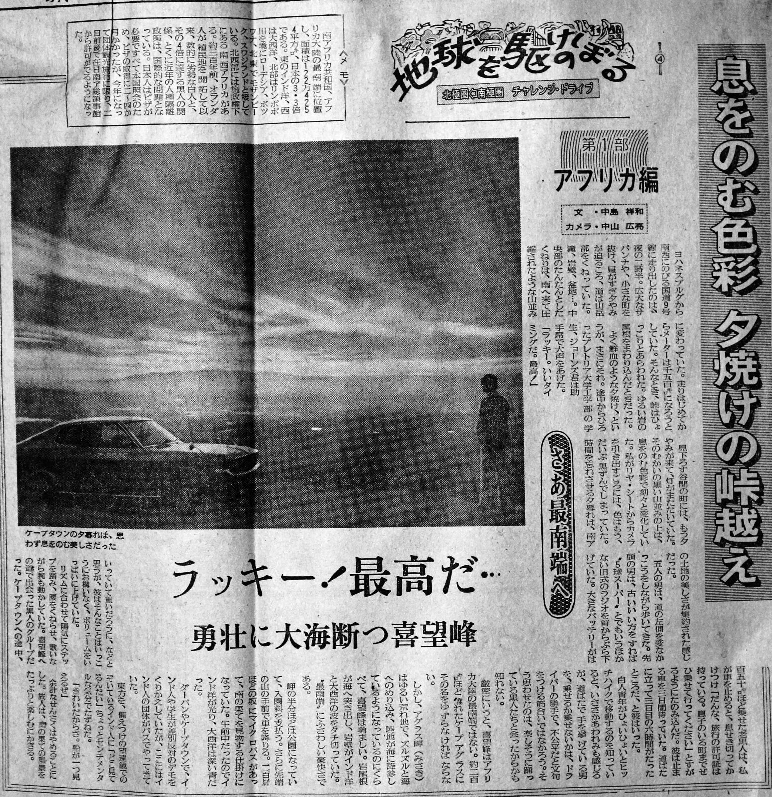 アフリカ大陸の最南端、ケープ・アグラス(南ア)を出たのは1972年の秋(五月)だった。赤道を越え、五ヶ月後にたどり着いたスカンジナビア半島の最北端、ノルド・かップ=写真・左=は秋だった。コロナ・マークⅡの走行距離は三万㌔を超え、貨物船も使った。ヨーロッパのハイウェーを走り、古い町並み、城、きらびやかな都会から、静かな北欧。アフリカは自然が溢れていたが、独立後、首都の賑わいをよそに、地方では“原始”へ向かって、逆走している印象の国もあった。様々な体験をした五ヶ月の旅だった。 【注に替えて】1972年の旅なので、今(2026年)から50年余も前になる。撮影した写真は会社の資料部に保管されていたが、いつしか捨てられてしまった。私も切り抜きや写真をなくしてしまい、今はいくらも無い。残念というか、お粗末というか…。中山君が個人で保存していた写真に、思い出すことを書き足した。 アフリカ諸国は独立ブームとでも言えるように、イギリス、フランス、ポルトガル、ベルギー…、などの植民地から抜け出している最中だった。車を受け取ったモザンビークの首都ロレンソマルケスは、マプトと都市名が変わった。ナミビアは南西アフリカの名称だった。北ローデシアはザンビア、南ローデシアはジンバブエ、ベルギー領コンゴはザイールに変わり、再びコンゴとなっている。 当時は色濃く植民地時代の風習などが残っていて、外国人が被害に遭うような事は殆どなかった。銃の支配の名残だろうと思った。南アでは国境の税関、入国管理で「白人」「非白人」の窓口が異なっていた。日本人は「名誉白人」として扱われ、白人の窓口に並ぶことになっていた。振り返ると小馬鹿にされたような気もした。 2015、2016、2019年に訪れたノルドカップはすっかり変わって、大きな建物や地球儀をかたどったものなどが作られていて、岬の先端に立つには入場料が必要だった。72年にはもちろんそう言うものは無く、写真の記念碑はノルウェー、スウェーデン連合王国のオスカーⅡ世が1873年7月に岬に立った記念碑です。ほかにはNのマークしか、ありませんでした。マークⅡで当時は岬の先端まで行けました。 |