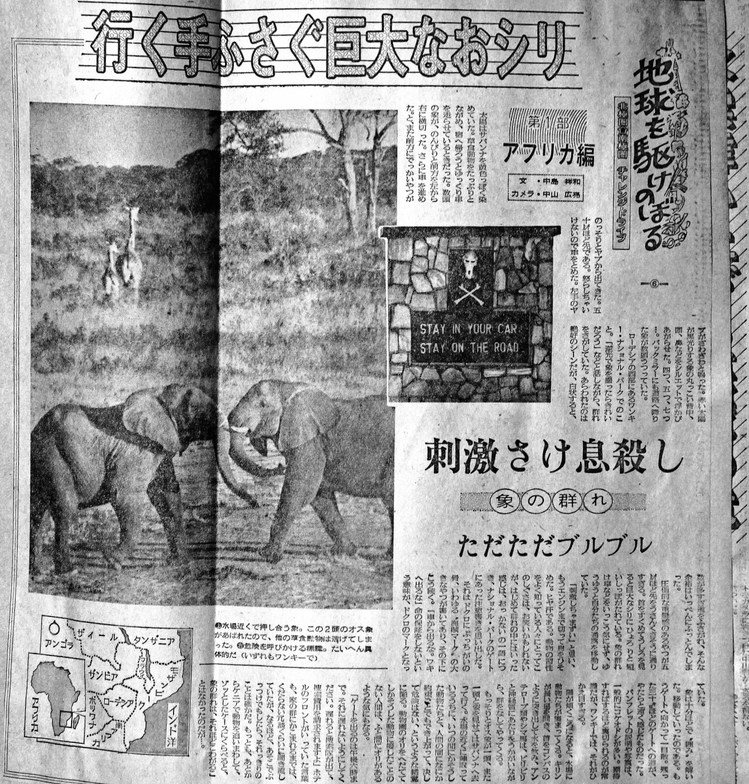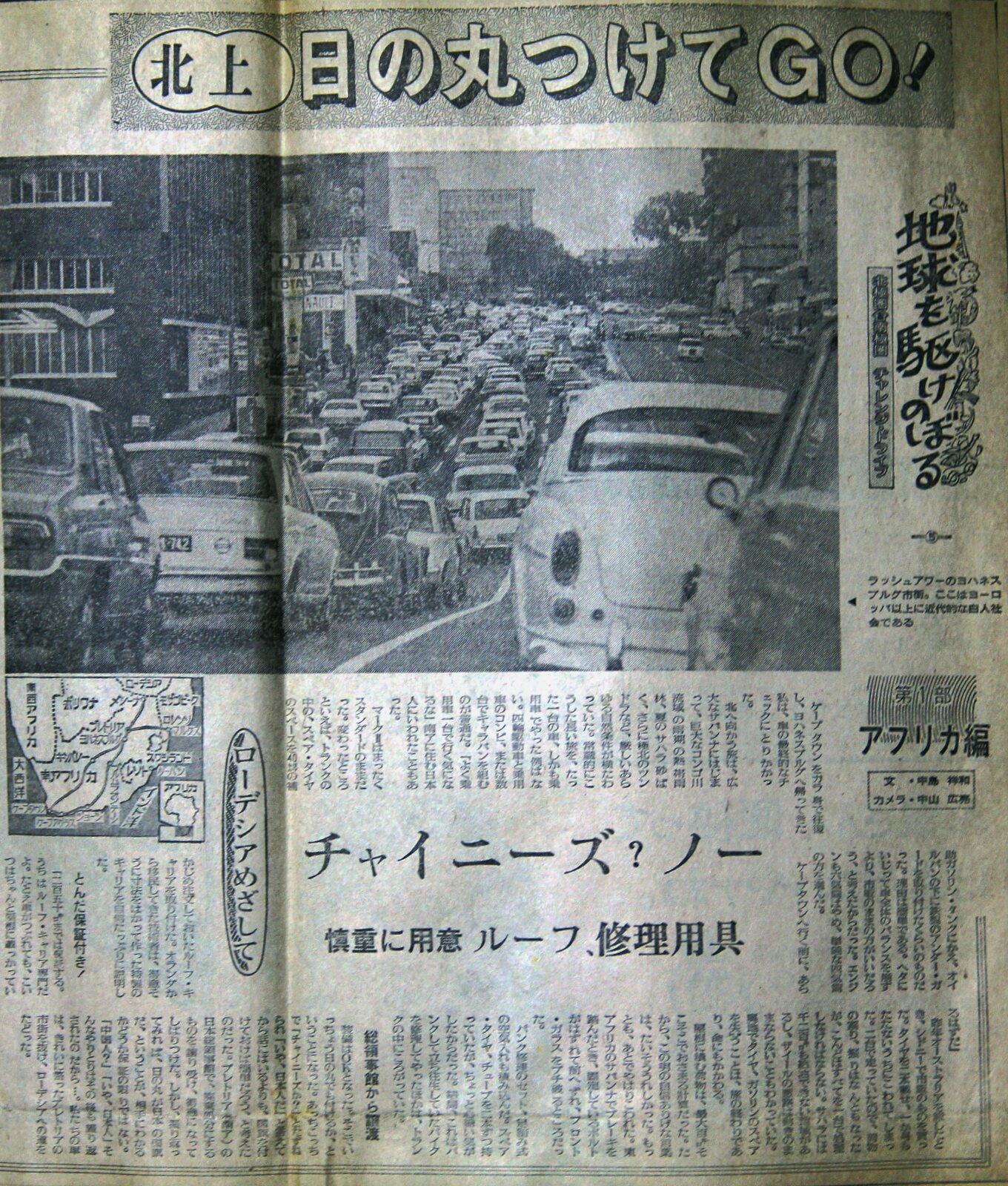 5)ローデシアめざして![]() ![]() ケープタウンをカラ身で往復し、ヨハネスブルグへ帰ってきた私は、車の最終的なチェックに取りかかった。北へ向かう旅は、広大なサバンナに始まって、巨大なコンゴ川流域の雨季の熱帯雨林、夏のサハラ砂漠、さらに極北のツンドラなど、あらゆる自然条件が横たわっていた。常識的にこうした長い旅をたった一台の車、しかも乗用車でやった例はない。四輪駆動と乗用車のコンビ、または数台でキャラバンを組むのが普通だ。 「よく乗用車一台で行く気になるなー」と南アに住む日本人に言われたこともあった。 マークⅡはまったくスタンダードのままだった。かわったところといえば、トランクの中の、スペアタイヤのスペースを40㍑の補助ガソリンタンクにかえ、オイルパンの下に鉄製のアンダーガードを取り付けたくらいのものだった。理由は簡単である.下手にいじって車のバランスを崩すより。市販のままの方がいいだろうと、考えたからだった。エンジンも六気筒はやめ、単純な四気筒の方を選んだ。 ケープタウンへ行く前に、あらかじめ中門して置いたルーフキャリアを取り付けた。オランダから移民してきた技術者は得意そうに寸法を測って作っ特製のキャリアを自信たっぷりに説明した。 「二百五十㌔までは保証する。うちはルーフキャリア専門だよ。たとえ車がつぶれてもこいつはちゃんと屋根に載っかっているいるはずだ」 昨年、オーストラリアを旅したとき、シドニーで市販のものを買った。タイヤを二本載せ一ヶ月のたたないうちにこわれてしまった。二台で走っていたので、荷物の割り振りはなんとかなったが、今度はすべてを一台でこなさなければならない。砂漠を往くか、ジャングルを選ぶか、その直前に決めるけれど、サハラには千二百㌔も給油出来ない地域があるし、ザイールの悪路は動きのままならないことも分かっていた。奥地でタイヤ、ガソリンのスペアを失うことは、旅の終わりであり、命にもかかわる。 屋根に積む荷物は、最大百キロそこそこで治まる計算だった。だからルーフキャリアを取り付けた男の自信ありげな言葉は、たいそううれしかった。もっとも、後でやはり壊れた。東アフリカのサバンナで、ブレーキを踏んだとき、想定していたボルトがはずれて前へずれ、危うくフロントガラスをブチ破るところだった。パンク修理のセット、足踏み式の空気入れも積み込んだ。スペアのタイヤ、チューブを二本ずつ持っていたが、ちょっと心細い気がしたからだった。結局これはパンクして立ち往生していたバイクを修理してやったほかには、トランクの中にころがっていた。 装備はOKとなった。そこでいっちょう日の丸でも付けるかということになった。あちこちで「チャイニーズか」とたずねられ、「いや、日本人だ」と答えて話に入るよりも、国旗を付けておけば簡単だろう、と考えたのだった。プレトリアの日本領事館で、廃棄処分するものを譲り受け、得意になって縛り付けた。しかし、振り返ってみれば、日の丸が日本の国旗だという事が、相手に分かるかどうか、保証の限りではない。 「中国人?」 「いや、日本人」 そんなやりとりは、その後も繰り返されルのだから…。私たちの車は、綺麗に整ったプレトリアの市街を抜け、ローデシアへの道をたどった。 |