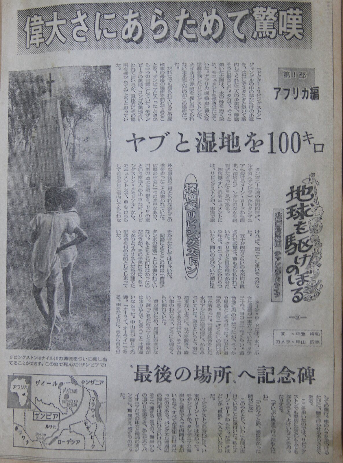 9)探検家・リビングストン最期の地 地平線まで広がるサバンナのなかに、一カ所だけ“雲”がわき上がっていた。そこがビクトリア・フォールだった。滝つぼからのしぶきが、氷柱のように舞い上がり、十㌔も離れると、雲が吹き出すように見えるのだった。滝と言うと山の急斜面を連想するが“対岸”との高度差は殆どない。緩やかにサバンナをうねってきたザンベジ川が突然、足元をすくわれるように岩の割れ目に落ち込んでいた ![]() リビングストンが死去した地 「ドクター・リビングストン」 ジャングルの中の草だらけの小道を、はだしでスタスタと歩いて案内してくれた二人の少年が、得意そうに指さした。夕方でグッと傾いた太陽は、木の幹を赤く染め、モニュメントを浮き立たせていた。アフリカ探検史に偉大な足跡を残したリビングストンが、ナイル川の源流を探し当てられないまま死んだのがこの場所だった。 誰にでも知られているこの探検家の最期の場所を訪ねて見ることを、ザンビアに入ったときから一つの目標にしていた。モザンビークの奥地、コンゴの奥地と言われてはいるが、具体的にその場所を確かめてみようと思っていた。 タンガニーカ湖の南約四百㌔、ルサカ(ザンビア)からタンザニアへ抜けるメーン・ロードから西北へ湿地とジャングルの中を約数十㌔辿ったところにある.四角錐のモニュメントには、リビングストンが忠実で素朴な原住民に看取られながらこの世を去ったことが書かれていた。 ![]() 案内してくれた少年とメモリアル 広場の中心に一つの井戸があり、円形の草ぶき屋根と、泥の壁という現地人の小さな村、“リビングストン・メモリアル”から、モニュメントまで、草を蹴散らした走る少年に案内して貰わなければ、迷ってしまいそうだった。五十㍍四方くらいの木が切り倒された広場は、草も刈り払われていた。クリクリと目を輝かせた少年は、モニュメントにかじりついたり、囲いのさび付いた鎖に足をかけたりしてはしゃいだ。 記録によるとこの村は「酋長チタンポの運営」としか書かれていない。元々名前はなかったのだろうが、その子孫達はちゃっかりとイギリス人たちが建てた記念碑を村の名前としてしまっていた。メーンロードには本当に小さな道標が一本立っていた。タテ二十㌢、ヨコ三十㌢くらい。黄色地に黒の字だったが、うっかり見落としそうだった。ひどい道である。長さ一㌔くらいの沼地が三カ所あった。両側は鉄色をした水がアシに似た草の根に絡みついていた。道はと言うと、沼に沈まないように、丸太を置き、盛り土をしてあるだけで、そこが古い車のワダチで、どうにも弱るくらい掘れていた。 草が深いため、見通しが利かない。落っこちたらズブリと車輪がはまり込んでしまうことは間違いなかった。中山君が降りて先導。 「オーライ、オーライ」である。声を頼りに、窓から首を出しての走行。車の腹をぶつけるたびに、腰を浮かせる有様である。ここを歩いたのではリビングストンでも熱病になるのはムリもなかろうと、余計なことをおもったりする。 「ずいぶん奥までいったもんだね」 「このヤブと沼、道はなかった時代にな」 このやりとり、如何にも間が抜けていることに気づいた。私はメーンロードからたった50㌔ほどしか“奥地”へ入っていないのだ。リビングストンの時代には、今のメーンロードはなかった。モザンビークか、タンザニアの海岸から徒歩で入った内陸は、道らしきものはなく、動物の踏み跡などの”すべてが道”の世界だった。バングエル湖周辺の湿地帯は確かにひどいけれど、そこへ達するまでの、海岸からの道のりを思うと、あらためてパイオニアたちの体力と精神の強靱さに、畏怖さえ感ずるのだった。 |