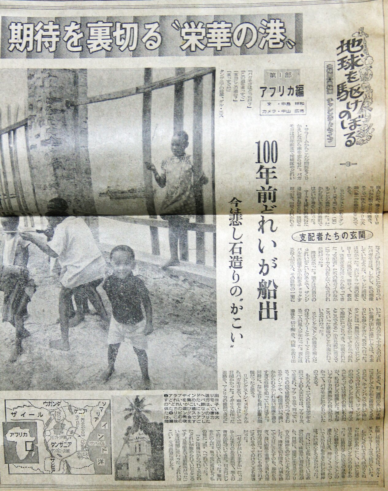 | 10)支配者達の玄関 ![]() 奴隷を収容して船を待った施設。今は遊び場になっていた 「バガモヨはどっち?」 「この道をまっすぐ」 「このままでまっすぐか?」 「そうだ。まっすぐ」 タンザニアの首都、ダル・エス・サラームからこんな会話を繰り返しながらクルマを走らせた。バガモヨは百数十年前まで、探検隊や奴隷商人達が,ヨーロッパなどから船でザンジバルへ着き、そこで一休みしてからアフリカ大陸へ第一歩を踏み出したところだ。 探検家・リビングストン(イギリス)、スタンレー(米=英)を始め、多くの探検家や奴隷商人が、ここから奥地へと向かった。だから我々は、今でもバガモヨは賑やかな港町ではないかと考えていた.後輪駆動のマークⅡは、荒れた砂の道で何度も足を取られた。地図と首っ引き。出会う人がいれば、言葉が通じようが通じまいが、お構いなしに訪ねた末に、やっとたどり着いた。 首都ダル・エス・サラームからそう遠くはないのだが、バガモヨの街は、想像していたのとはまるで違う,さびれた街だった。古いアラブ風、ヨーロッパ風の家や、頑丈な要塞が有り、お決まりの教会もあった。様々な国からやってきた“支配者”達の夢のあとでもある崩れた家に、アフリカ人が住んでいた。港はなかった。港の痕跡は石造りの“奴隷囲い”の跡で、ザンジバルを往復する小型船をチェックする役人が三人、その石囲いの中の一室にいた。 年間八万から十万人の奴隷を運び出した港にしては、余りにも静かすぎた。教会へ行ってみた。小さな板にこんな文字が書かれていた。 「奥地で死んだリビングストンが、遙か二千㌔を担がれて海岸にたどり着き、安置されたところである」 リビングストンの遺体を運んだリーダーはスージーとチューマと呼ばれた二人の黒人少年だった.彼らは遺体を切り裂き、内蔵を取り出して腐敗を防ぐため、約二週間の間太陽に晒してから布と樹皮でくるみ、さらにキャンバスを巻いて棒にくくりつけて担いだという。亡くなったところは、リビングストンメモリアルと名付けられて、ジャングルと湿地のなかだった。探検家に忠実な少年は、約九ヶ月かけて、バガモヨまでジャングルと湿地を歩いてたどり着いた。 二人の少年には六十人の人夫達がしたがっていた。アフリカ生まれのアフリカ育ちでも、猛獣のうろつくサバンナやジャングル、湿地帯を歩くのは容易ではない。しかも、よそ者は転々とある部落の、見知らぬ男達に、何時襲われるかも知れない別の危険もあったろう。そしてバガモヨまでの長い距離。リビングストンからバガモヨまで、クルマを走らせて二日間かかった。イギリスの作った道路を、アメリカの援助で拡幅されて、南アからザンビア、そしてタンザニアのダル・エス・サラームまで続いていた。舗装はしてなかったが東アフリカの大動脈だ。 しかし、その道路でさえ曲がりくねった峠道もあったし,緩いうねりを繰り返すサバンナも越えなければならなかった。圧倒的な広さのなかを、幾ら尊敬するリビングストンの遺体とはいえ、棒にくくりつけて交代しながら、九ヶ月も歩き通した精神にはただ感心するばかりだ。教会前の看板は古びて半ば剥げ落ちていた。、書いてあることから、忠実に生きたアフリカ人や少年達の精神を垣間見たように感じた。開発が進み、西欧の影響を強く受けるようになった今日では、こうした純朴で,献身的な心は既に失われてしまったものかも知れない。 遺体を切り開き,内臓を捨てて天日に晒すのは、長い距離を移動するために、長い時間をかけるには合理的な方法だ。誰にも命じられずそれをやってのける知恵にも感動させられる。 「ガイドは要りますか」 なまりのある英語で黒人の青年が近づいてきた。日本円にして三百円ほどで良いという。それではと案内を頼んだ。真っ先に彼は、先ほど見た“港”へ連れて行った。 「ここは奥地から連れてこられた奴隷が集められたところです。五年前まで(1967年)は刑務所だった」 今は税関に変わった“奴隷囲い”を無表情で示した。子供達が檻の跡だろうか、コンクリートの柱が並ぶところで遊んでいた。 |
