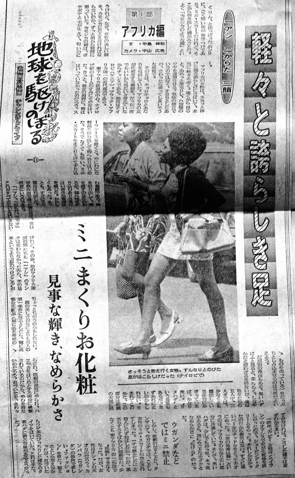 | 11)化粧品はまず脚に ![]() クリンと出っ張った尻に、ごく短い布が巻き付けてある。ミニスカートだけれど、そこから突きだした脚が見事だ。よく「カモシカのような脚」と言うけれど,なぜ,女性の美しい脚をカモシカにたとえなければならないのか、ずっと前から疑問に思っていた。カモシカの脚はぼてぼてと毛が生えていて、短いのに―。 アフリカの女性は、すかっと伸びた脚を誇らしげにさばいて、本当に軽々と歩く。遠くから見ると,ぬめっと黒光りし,は虫類ツヤを連想させる。気味の悪さで言うのではなくするりとした、触ったら滑ってしまいそうな感じを受ける。 その女性はキョロキョロと辺りを見回していた.アフリカの女性が化粧をする場面を,一度でも良いからみたいと考えていたから、チャンス到来である。 場所はナイロビ(ケニア)。ブラックアフリカ随一の近代都市である。東アフリカ鉄道、ナイロビ駅の隅にその女はいた。きっと彼女の視界には、男どもは入っていなかったのだろう。スーツケースを置くと、やにわに化粧品を取り出して脚へ塗り始めた。そうでなくても短い、ミニスカートをまくり上げて擦り込む奮闘である。 鏡を取り出して顔を直すのなら分かるが,脚へアブラを擦り込む有様にはいささかの異様さを感じた。もっともその理由はすぐに判明した。バーで会った男達に尋ねると、あっさりと訳を話した。 「一に脚、二にからだ、三に顔だ」 女性の美しさをはかる目の付け所と言う訳か。これが全て正しいとは言えないけれど,その後、他のアフリカ諸国の男達も「一・脚」のランクは変わらなかったから、基準と言うより,そこに注目と言うところかも知れない。脚の美しさが、何よりも美人?の第一条件となるとしたら,脚に高価な化粧品をたっぷりとしみこませるのは当然と言えよう。事実街では脚専用の高価な化粧品を売っているのだ。 だが、別の理由もある.黒い肌をフト見ると,柔らかくしなやかだと思わざるを得ないが、実は彼女達の五人中、二人までは,少なくとも露出している部分に限って言えば,かなり荒い。“サメ肌”という言葉もあるが,まずそれに近いのかも知れない。生まれてこの方、この部分は乾期のの太陽に照らされ,雨期の湿気にやられ、蠅や蚊を初めとする虫に襲撃されているのだから、やむを得ないのだろう。近づいたり、触ったりしてみなければ、こうした様子はまず分かるまい。 一昨年、イランのカビール砂漠のオアシスで、女が化粧品を欲しがったので,シェービングクリームをやった。それしかなかったのだから,悪気があったわけでは無い。すぐに顔を覆っていた布を外し、顔に塗った。「美の基準は脚」というのは、アフリカのかなり広い地域に共通していたが、中東はそうではなかった。黒い肌は,少しでも脂っ気、水気があると、実に見事な光沢と滑らかさがあるように化けるのだった。 しかし,悲劇的なことに、タンザニア、ウガンダでは今年(注=1972年)女性のミニスカートが禁止された。「なぜ禁止したのか」と尋ねるチャンスはなかったが,ぬめっと光る素晴らしい脚線美が、少なくても東アフリカの二カ国で“見物”出来なくなった。だが、女性はおしゃれの天才なのだろう。カンパラ(ウガンダ)の街角で新しいファッションをみた。超ミニスカートとしか見えなかったが,近くで見ると焦げ茶のぴっちりとした、厚手のタイツをはいていた。ミニンの下にはしっかりとタイツ。これはまた、素肌に勝る遠目の効果はあるようだった。 |