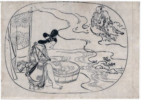 久米も頑張って仙になり空に昇って飛ぶようになった。快適に飛行しているとき、ふと下界を見ると吉野川のほとりで若い娘が衣を洗って立ち上がった。