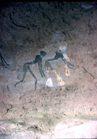 腹がポッコリと出ているのは、別に食いすぎという訳ではないでしょう。絵の様子から見て女性のようにも見えます。ズボンにもラインが入り、膝下までの長さです。お洒落なサハラの人たちを、彷彿とさせる壁画です。