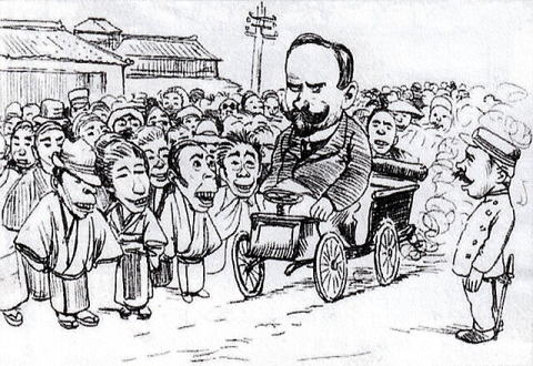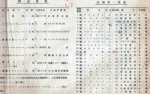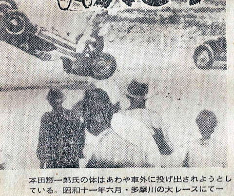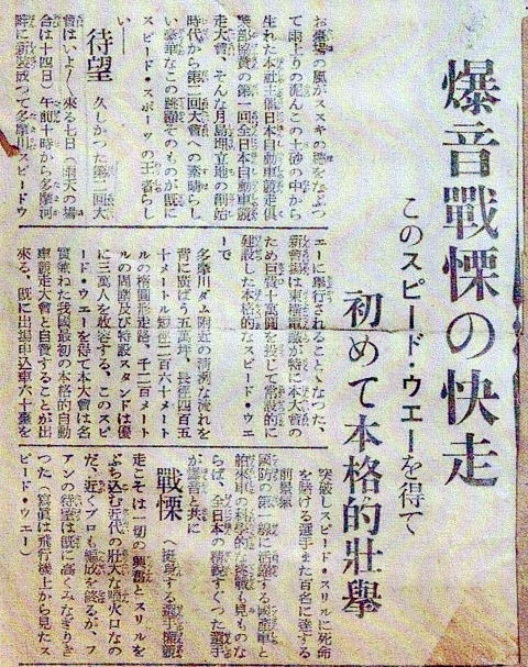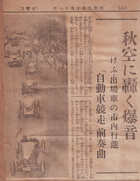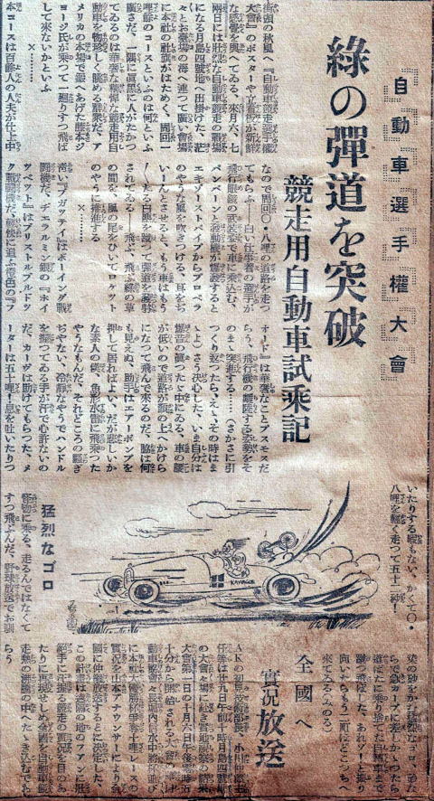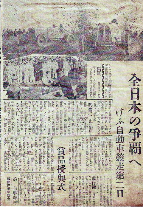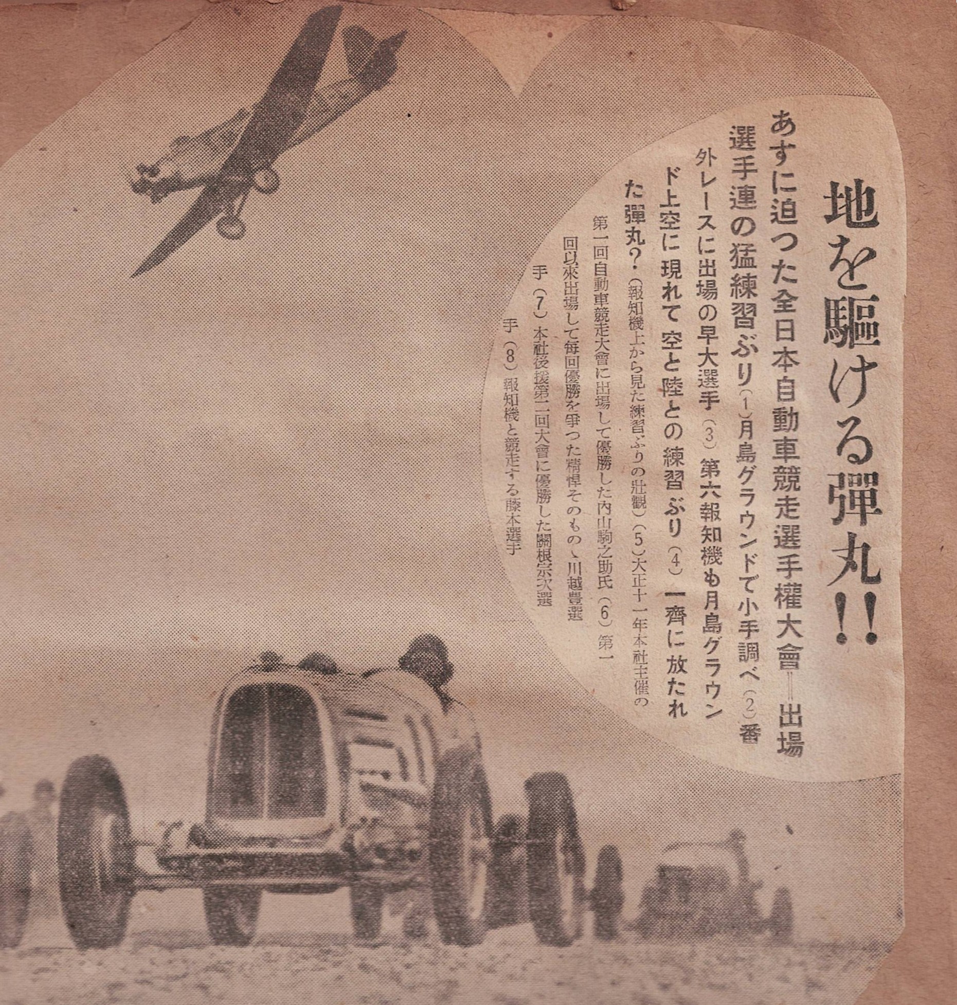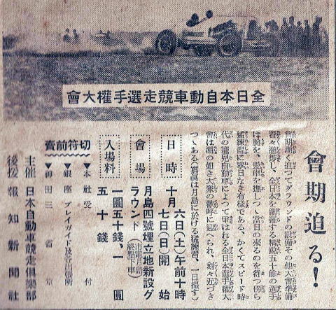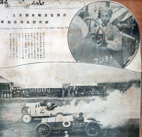 | ユーラシア大陸をリスボンからインドまで走りながら、藤本さんにはいろいろなエピソードを聞いた。帰国後も新橋にあったイースタンのビルを訪れて昔話なども聞いた。日本での自動車レースを開催するために、大変な努力をしていたのがよく分かった。 「クルマは1台、ハドソンをアメリカから持ってきたが、競争する相手が居ない。そこで汽車と競争する話を報知新聞に持ち込んだ。州崎や月島のレースはその後だよ」 まさに日本自動車レースの門を開いたのは、横で運転している“この爺さん”,藤本軍次さんだと改めて思いながら道路などは全く未知の国々を走り続けたのだった。 ![]() 東京に初めて出現した自動車。フランスの風刺画家、ジョルジュ・ビゴー。1882年(明治15年)~1899年(明治32年)の間日本に滞在した。(ウイキペディア) 日本にクルマが持ち込まれたのは1898年(明治31年)でフランスのエンジニア、ジャン=マリー・テブネで、クルマはパナール・ルバッッソール。このクルマが日本で初めて街を走行した。東京・築地から上野までで、大変な話題になったようだ。当時は人力車、駕籠、馬車、それに歩きが交通手段だったので、驚きもひとしおだったろう。しかし、日本に自動車が普及するのは、昭和に入ってからで、大衆化するのは1970年を過ぎてからだった。 ![]() ![]() 日本で初めてレースが行われたのは大正11年(1922年)の秋だった。藤本さんが東京~下関間のを汽車と競争した様子が当時の報知新聞に掲載され“競争自動車”への興味が盛り上がって来た。残念ながら州崎での第一回日本自動車競争の写真は入手していないが、藤本さんは東京~下関間の汽車との競争後、報知に入社し、上層部と交渉してレース開催に尽力している。 州崎のレースは汽車と競争の記事が出てから、自動車競争に興味を持つ人が急に増え続け、報知の主催で行うことになった。ひとたび自動車競争の企劃が発表され「日米選手23名出場」とのポスターが出ると大変な盛り上がり。開催当日は約5万人の観客が押し寄せ、柵を破って場内へなだれ込み、警官と殴り合いを演ずるなどの騒ぎまであった。 レース出場車もさまざまで、内山民之助さんは、チャルマーというクルマの胴体にガソリン用の5㌎缶を針金で巻き付けて座席代わりにして出走するなど、なんとかクルマを走らせる工夫をしていたよ。 自動車競争は年代も昭和に移り、代々木、立川、大阪、名古屋練兵場、月島4号埋め立て地などで開催されて人気は高まり続けた。昭和11年5月の多摩川スピードウェイの完成が最高潮=後に写真・記事掲載=だった。 ![]() この写真は1923年(大正12年)の東京・州崎埋め立て地です。説明文をわかりやすくすると次の通り。 「我が国では珍しい催しだったので非常な人気を呼んだ。砂煙を立てて疾走する様は実に愉快だった(写真上は藤本君)。下は北米ロスアンゼルスのハリー・ミラー氏の製作になった一人乗り競争自動車で、堅牢な構造と快速力を特色としている」 ![]() 1934年(大正9年)東京・月島埋め立て地のレース開催の告示です。東京で当時、最有力の一般紙だった報知新聞からの切り抜きです。この告示に続いて、月島四号埋め立て地へ行くための略図なども掲載されています。 ワシは6歳の時にシアトルへ行った。両親が移民して先に行っていたのでそこへ呼ばれたのよ。向こうで百姓をやるのがイヤでね。兄(頼一)と一緒に“ジャクソン商会”という名のハイヤー会社を作って、好きだった車を専業にしたのさ。その時ワシは17歳だった。クルマははウイントン2台とパッカード1台だった。しばらくして販売もはじめたのだよ。 アメリカでレースに出場したのは1918年(大正7年)だったな。あの当時はブレーキはない。タイヤも32㌅四分の1くらい、馬車の車輪のようなものだったね。そんなクルマで田舎の野菜展覧会とか家畜の博覧会なんかの開催場所へ行って興業していたのさ。会場は競馬場だよ。博覧会場みたいなところには必ず競馬場があった。1㍄くらいのものだったな。あの当時は田舎じゃ、馬が交通手段だったからねー。クルマはダッジ・マーサー、ディーゼン・バーク、ハドソンなんかが主力だった。第一次欧州大戦前後のアメリカのレースと言えば、こんな所だね。 日本での自動車レー(と呼べるかどうかも含めて辿ると、1911年(明治44年)目黒競馬場で「飛行機と競争」があった。クルマ同士は1944年(大正4年)目黒競馬場でアメリカ車4台の競争が有ったが、大赤字。以後、藤本さんが帰国して、汽車と競争して話題を撒き、報知新聞の企画部長、煙山一郎さんを口説いてレースを之主催を頼み込み、開催にこぎ着けた州崎のレースまでほぼ空白だった。 1934年10月の報知新聞の切り抜いた紙面をそのまま掲載します。 ![]() かなり読みにくいが、虫眼鏡を使えば,なんとか読めます。藤本さんは軍次の名前はアメリカ人にはスラングで「悪い言葉」に聞こえるとかいって「ジョージ」と自称し、友人たちにもそう呼ばせていました。実際