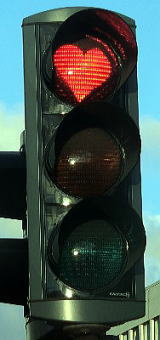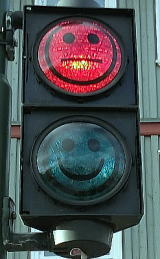 レイキャヴィクの横断歩道信号は赤の時には口を結び、緑は笑い顔。アクレイリでは赤信号がハート型になっていた。