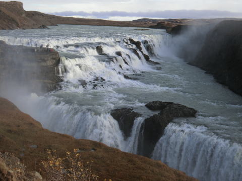 写真はグトルフォス(黄金の滝)と呼ばれています。幅70㍍、落差32㍍とそう大きくはないのですが、すぐ側まで近づけるので、思いの外、迫力のある滝です。