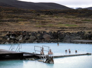 湖の周辺はごつごつとした“鬼押し出し”状の大地が続く。湖水の中にも溶岩の突起や小さな島があり、名所となっている。バスはやはり湯温が低く、「風呂に浸かる」という気分ではない。大きな温水プールと言ったところは、ブルーラグーンと同様だ。もちろん水着着用。