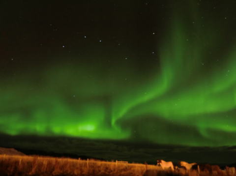 北斗七星が輝き、オーロラの下、アイスランドホースがたたずんでいました。気温は意外と高く、マイナス4度ほどでした。アイスランドはオーロラベルトの下に、すっぽりと収まる極北の島国ですが、海流の影響で寒気はそれほど厳しくはありません。