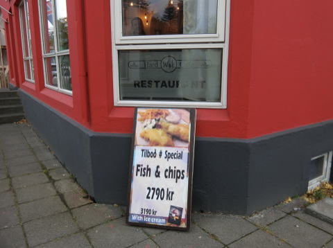 今回のアイスランドも同じ手口だった。荷物の重さはジジ・18㌔、ババ・16㌔と制限の20㌔を下回った。余計なものはとにかく持たない。行き先は文明国。いざとなれば買うことに不自由はない。そんなわけで、今回は空港のホテルで到着した翌朝に朝飯を食べた以外は、一切自前。昼は海苔弁当に鮭、卵などのおかずだった。ちなみにSauoarkrokuurという北の小さな村のレストランにかかげられた価格を掲載しておきます。フィッシュ&チップスが3000円近い。これはコロナ流行以前なので、ウクライナ戦争の最中出会い間(2022年令和4年)はかなり高いと思いませんか(1クローナは約1円ほど)。