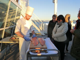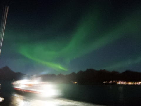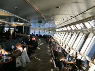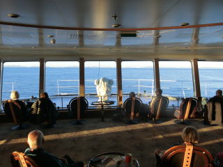 ![]() ノルウェーのボードーで巨大渦巻きを見に行きました。大きなゴムボートで突っ走るのですが「落ちたら5分は探すが、おそらく見つからない」そうです。乗ったとき80歳オーバーのジジ・ババですが、即答で参加すると返事をしました。操船は豪快で、バイキングの子孫の操縦だからでしょうか、そりゃ、猛烈でした。 ![]() ベルゲンからヨーロッパ最北の港町、キルケネスまでノルウェーの大動脈とも言える貨客船、フィテルーテンに乗って北上した。島やフィヨルド、山などで国土が、切り分けっれ、隔てられたノルウェーは、鉄道でさまざまな都市を結ぶのは不可能に近い。バイキングの時代から、船が主要な交通機関になっていたのは頷ける。 北行きの船は海が内陸に深く切れ込んだ所にあるボードーの港で、約6時間停船する。客よりも荷物を運ぶために開設された航路だから、荷物優先は当たり前だろう。船をチェックするのもこの港が北へ向かうと最後になる。観光客の増加に伴って貨客船に変化し、今は一日一便、ベルゲンから最北の港町、キルキスクへと約一週間かけての航行だ。 ロビー兼展望室へ出向いたら「ボートで渦巻きを見に行かないか」と船専属の旅行社の人に声をかけられた。冒険的なことが大好きなので歳も顧みず参加することにした。 「さあ、乗ろう」 装備は万全。気合い十分のババ もこもこの防寒兼浮上用のつなぎを着せられた。冷たい水中に落ちても、浮き上がり、10分以上は問題なく生存できるとツアー・ガイドは言っていたが、船頭は渦潮の中へ落ちたら「5分は捜索するが、まず生存のl可能性はない」と言い切った。 ![]() 一隻のゴムボートに9人が乗り込む。箱のようなものが縦に並び、それにまたがる。各“席”の前にはコの字型の鉄のバーがあって、それにつかまる。ヤマハのドデカいエンジンがついていて、猛烈な加速だ。 ![]() ![]() 靜かな海を30分ほど航行し、フィヨルドに進入。自動車用の橋の下の靜かな場所で潮が満ちてくるのを待つ。外海と長く切れ込んだフィヨルドで潮の水位が大きく変わり、渦潮が発生する。見上げる橋が有り、その下あたりを中心に大きな渦巻きが潮の満ち引きによって発生する。海峡の幅も渦の大きさも、鳴門海峡と同じように感じた。違うのは鳴門海峡は渦潮見物の船がもっと大きく、窓もあってノルウェーのように、飛沫を浴び、手を離すと渦の中に転がり落ちそうなボートではないこと。しかし、船頭たちは「この渦は世界一」と言い張って譲らない。ま、どっちでも良いことなので、聞きおく、の心。 ![]() 「落ちた人はいないので安心して下さい。ただ舟は大きく揺れますから、しっかりとつかまっていT下さい」 それだけの注意でいやはや、渦が巻き始めると、ボートは渦の発する飛沫に飛び込んだり、ほどほどの渦は突っ込んで反対側に駆け上がったり、さらにはデカイ渦の“壁”すれすれを爆走だ。たっぷり写真を撮ろうと最前部に陣取ったが、考え違い。片手を離してカメラを構えるなど、至難の業と納得し、ひたすら水面と渦を見つめてバーを握りしめる有様だった。 ![]() とまあ、そういうわけで渦潮が収まると、嘘のように靜かな海面に変わる。スリルたっぷりで、日本じゃちょっと味わえない体験だった。好んで乗ったのに、ほっとするのはジェットコースターが降車場に到着した時と似た気分だった。 フネに乗ったついでに、貨客船の様子をちょっと掲載します。 ![]() 最前部の3階でしょうか、4階にあたるのでしょうか、展望ロビーがあります。自由に利用出来るようになっていて、もちろん無料です。オーロラの出る時間になると、ここに陣取り、すぐ裏側のドアから広いデッキに出ると、フィヨルドの様子が見渡せます。もちろん天空も…。 ロビーのソファでのんびり外を見ていると、なんだか空が“ざわつく”ように感じます。 「それ来た」 と外へ出ます。その頃、操縦室から「ノーザンライトが出てきます」の放送があり、人々がデッキに現れます。そしてオーロラ。我ら運が良かったようで、飽きるほどオーロラにご対面できました。 航海中、オーロラの前に、サービスがあります。夕方、階上デッキでスモークサーモンを無料で振る舞います。なかなかの味覚でご相伴に預かりましたが、約1週間の航海なのでチャンスは一度だけでした。 ![]() ベルゲン行き、南下する姉妹船とすれ違いました そんなこんなで貨客船の旅も結構楽しめます。状況によっては深いフィヨルドの奥にある集落まで航行したり、船腹が岸壁とこすれるのではないかと気になるような、狭い航路を通ったこともあります。3度ほどしか乗っていませんが、フィヨルドの旅も昼は周囲の漁村や山々、夜はオーロラと、結構楽しめます。 |