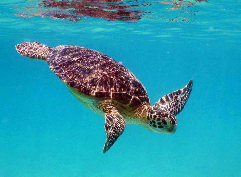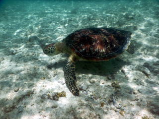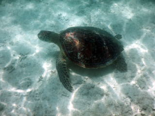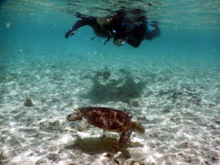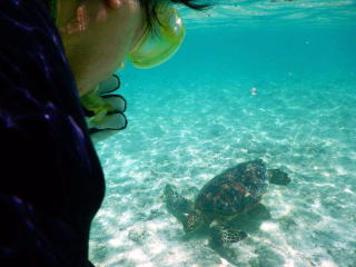 海亀を見に行きました。出かける前に、潜りが得意な友人に話したら「なかなか見つからないよ。アクアラングを使わないで潜るんじゃ、長くは沈んでいられない。深いところも無理だしな」と笑っていました。ギリシャの海でさんざん潜ってはいますが、素潜りなので海亀はモーターボートの本当にボロくて遅いのを、トロという内海で借り、浮き沈みしていた海亀を見ただけです。