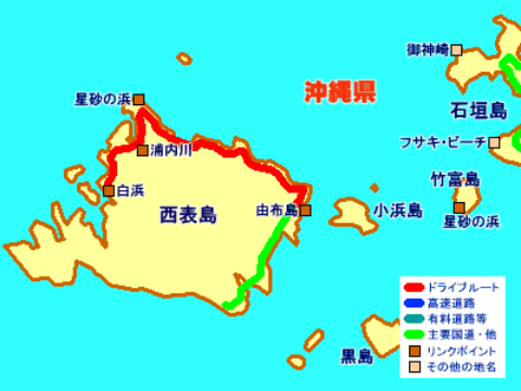 島の約90%が亜熱帯のジャングルに覆われた西表は、沖縄本島に次いで大きな島だが一周道路はない。東部の南風見から西部の白浜までの道沿いに集落が点在している。周囲は約130km、面積約290m2、人口約2,242人(2004年現在)。