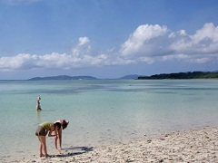 集落からマイクロバスでカイジ浜へ。幸福を呼ぶとして知られる“星の砂”がとれる浜で有名なところ。この星の形をした砂は珊瑚の死骸だが、20数年前に訪れた時とは異なり、採取禁止になっていた。手の平を広げて砂に押し当て、その手の平についてきた砂だけが持ち帰れるという。