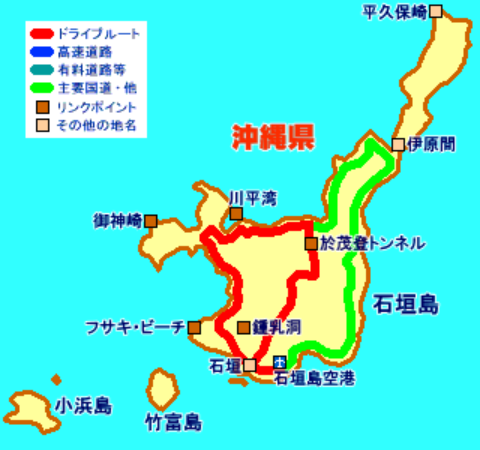 <コース> 石垣空港-バンナ展望台-八重山鍾乳洞-観音崎-御神崎-底地ビーチ-川平湾-米原-底原ダム-伊原間湾-平久保崎-宮良-真栄里ビーチ 全行程 140km ![]()