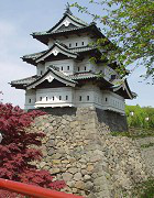築城は慶長16年(1611)で、天守閣は江戸時代に一度再建されている。また城門などを含めて重要文化財に指定されている。 天守閣には当時の鎧、刀などの武具をはじめ城内で日常使われていた品々が展示されているが、天守閣の堅固な造りの窓からは城内の池を鏡に映す岩木山の眺めを絶賛、しばし殿様気分が味わえる。